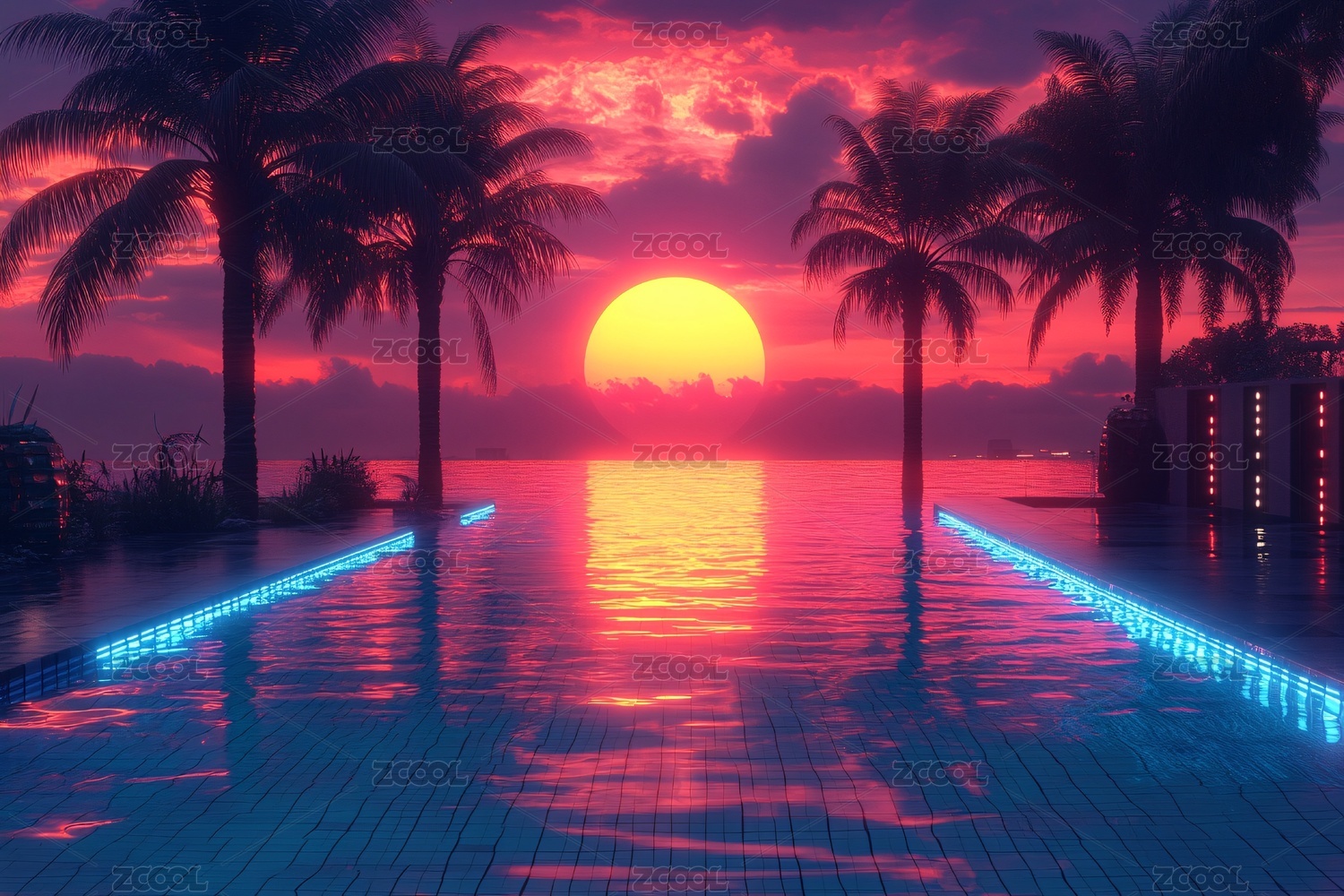 夕阳下的泳池与棕榈树美景