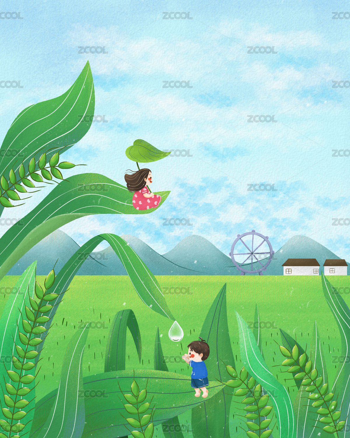清新绿色小满插画稻田里的小朋友