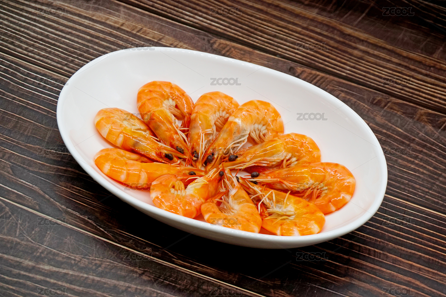 木桌上的一盘白灼虾基围虾特写