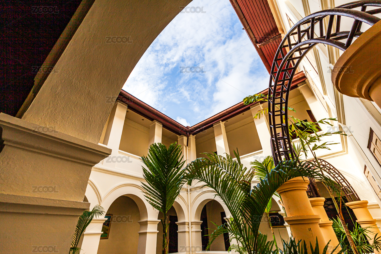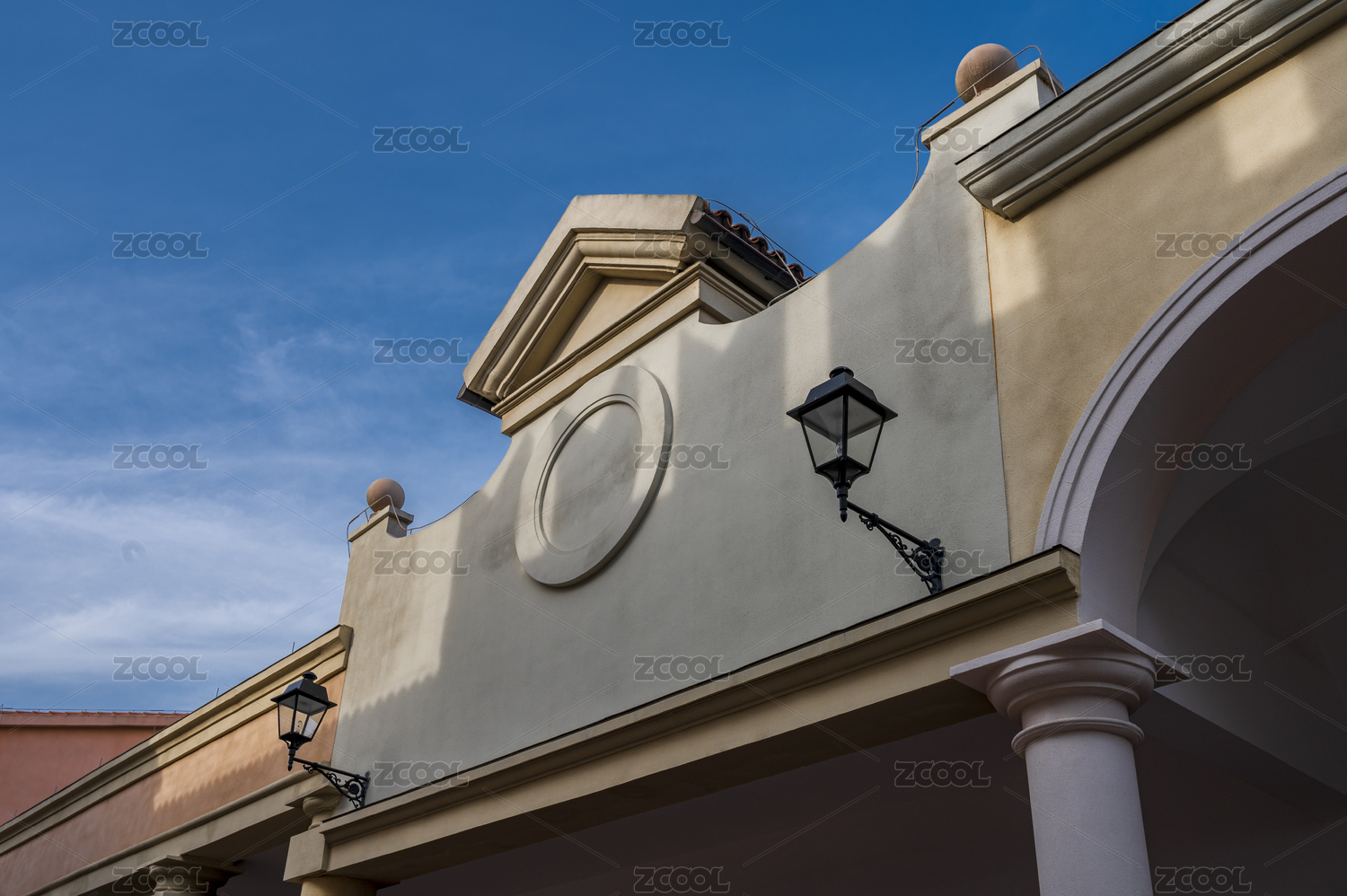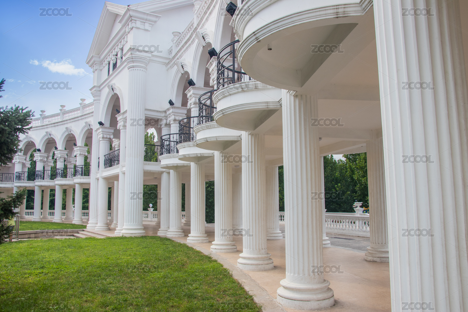 蓝天白云下的欧式白色建筑物回廊