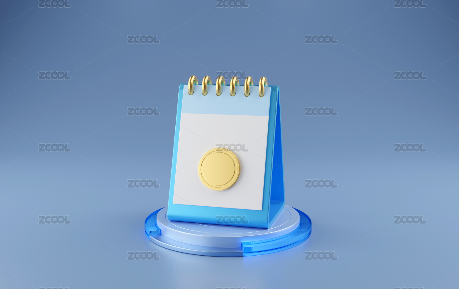 圆台上3D蓝色日历记事本与金币组合素材