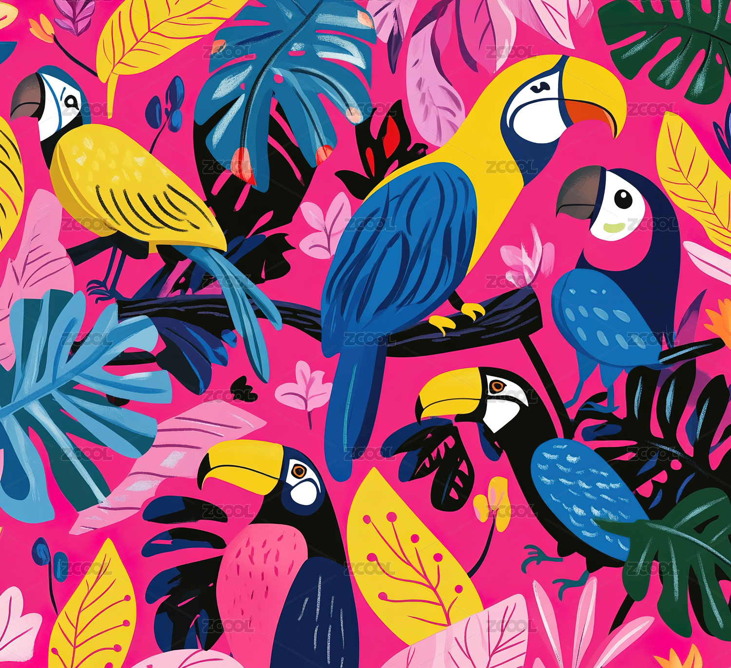 热带鸟类和树叶的生动插图