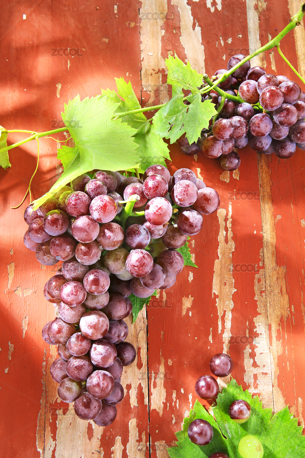 带叶子的葡萄放在红色的木板上