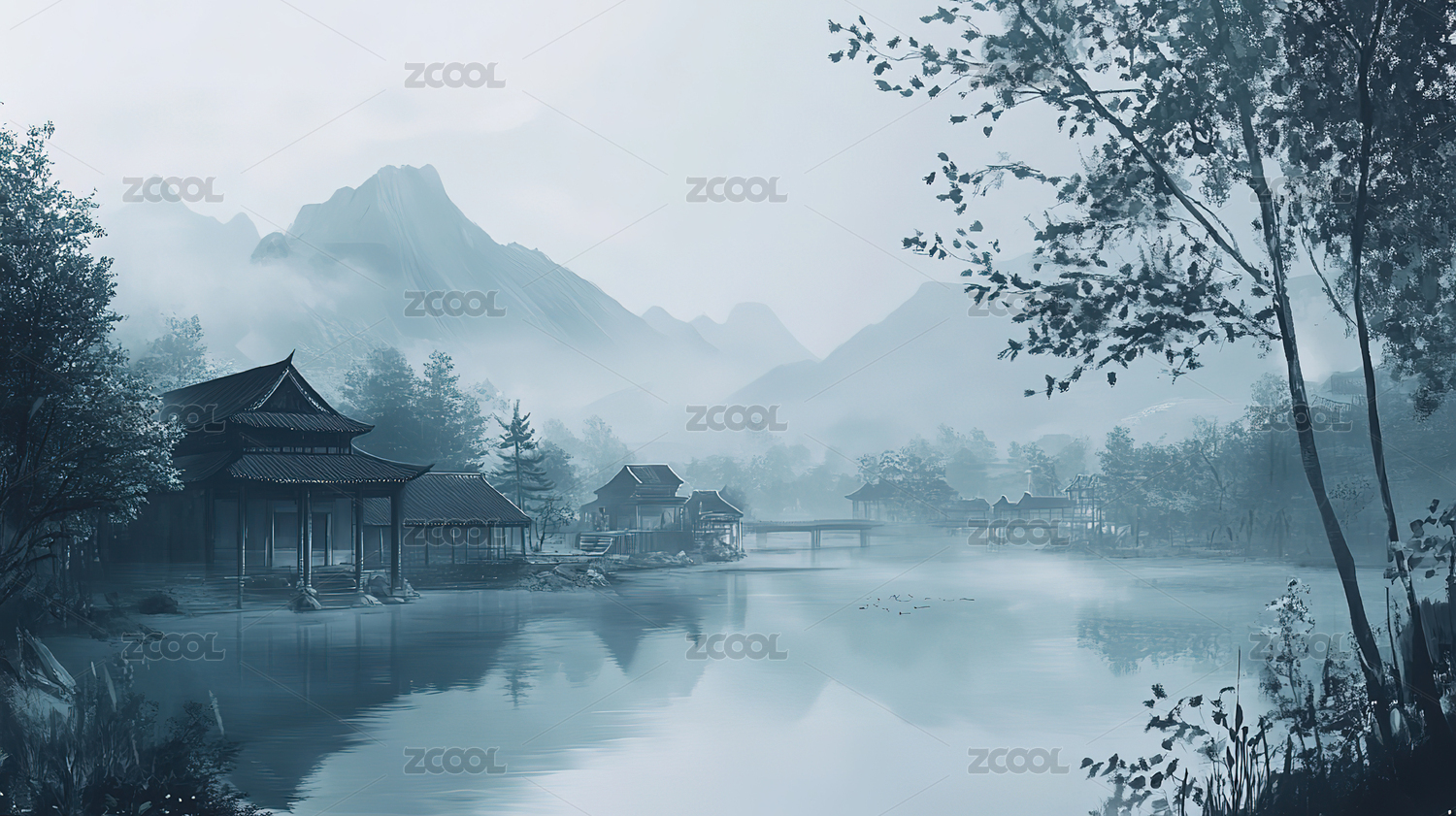 雾气,宁静,祥和,风景,3D,山水画,树木,AI,数字艺术,小屋