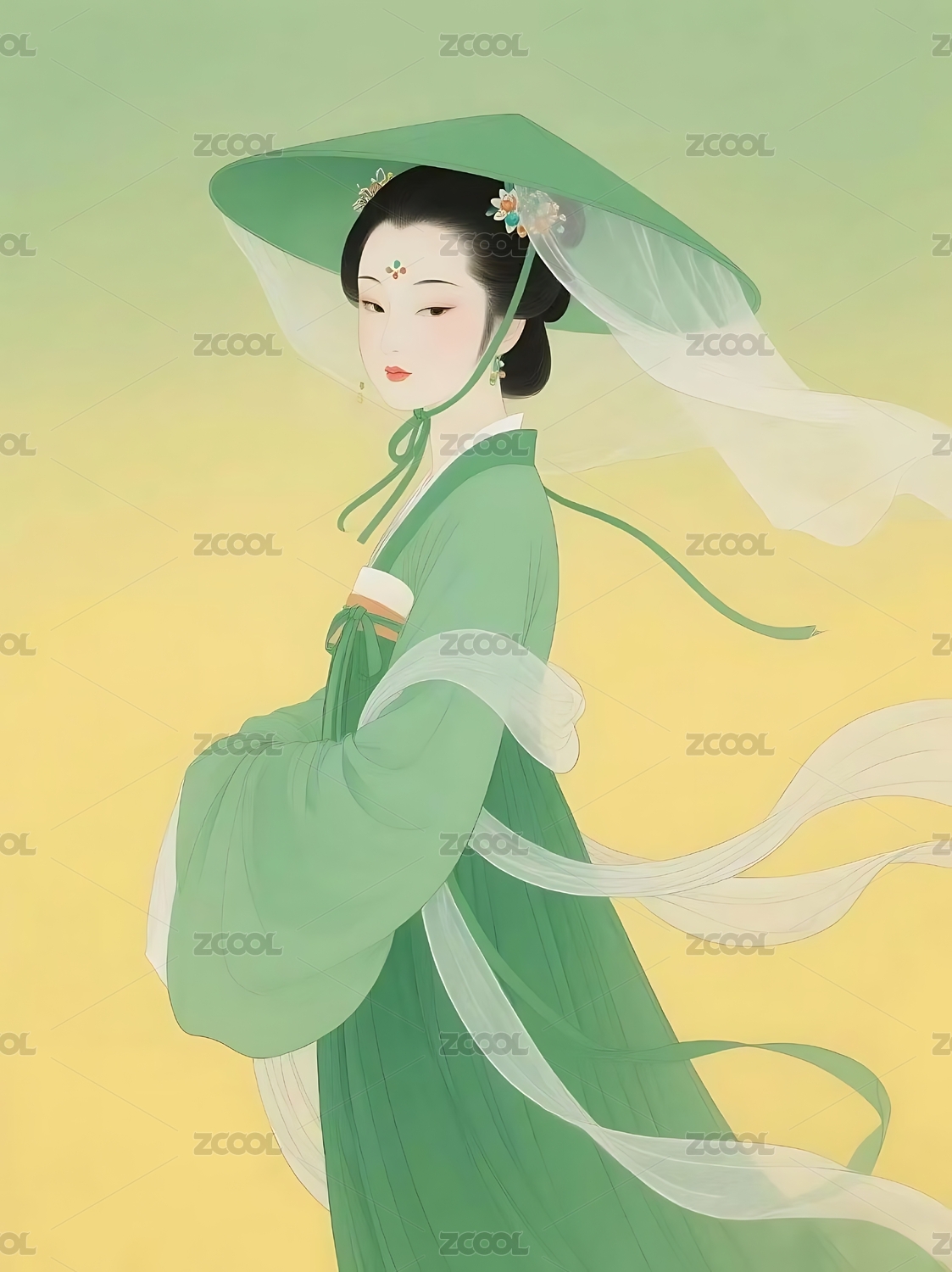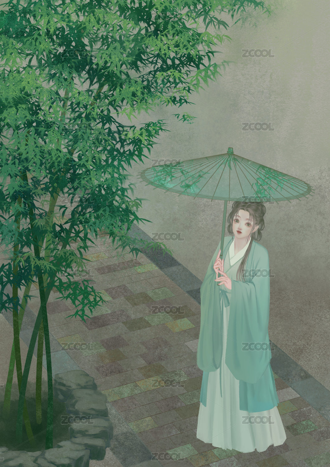 户外亭子走廊栏杆坐着汉服古装女人休息睡觉
