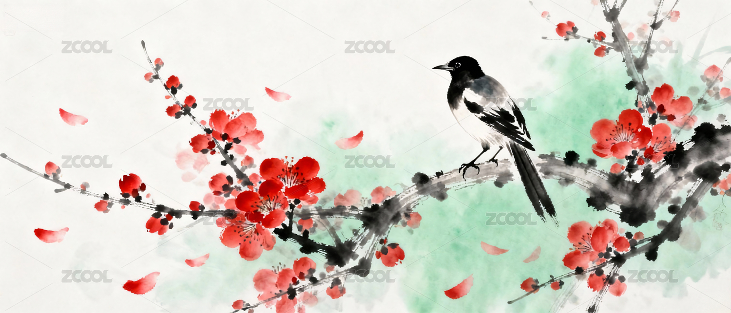 中国,水墨,喜鹊,梅花,花朵,树枝,毛笔,山水,笔触,艺术品