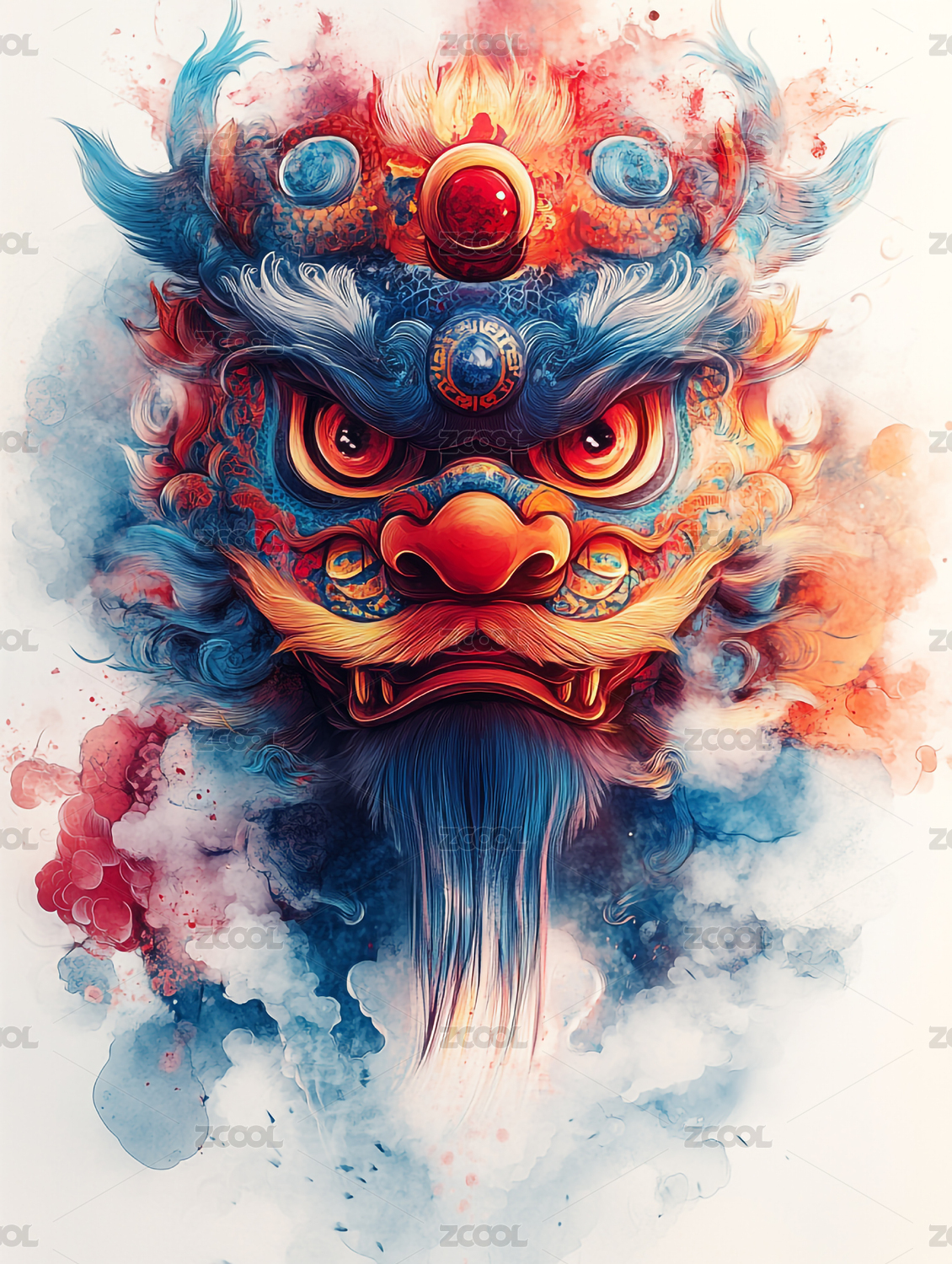 中国春节吉祥物醒狮手绘插画