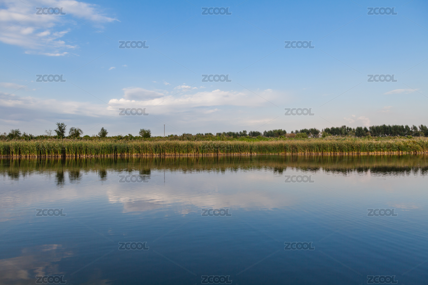 晴天里中国微山湖上的湖面和远处的芦苇荡湿地