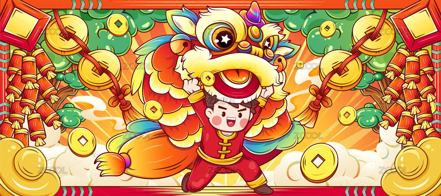 国潮喜庆龙年春节舞龙福龙贺春插画