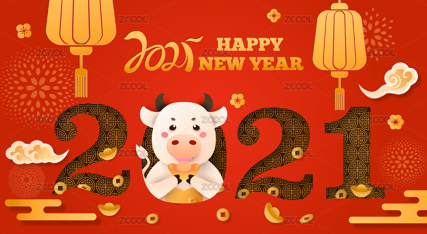 牛在舞狮来庆祝新年2021年牛年到来插画