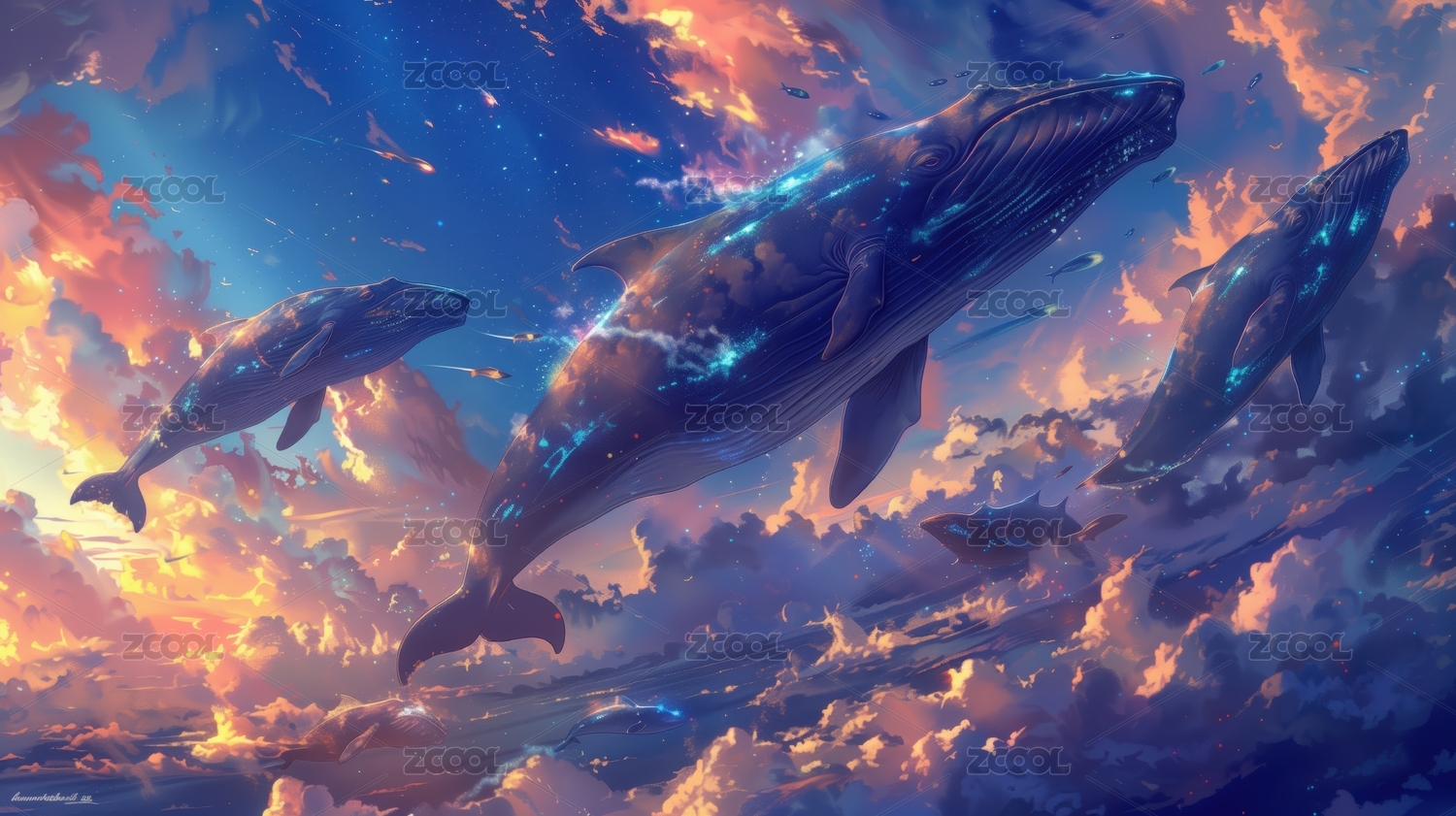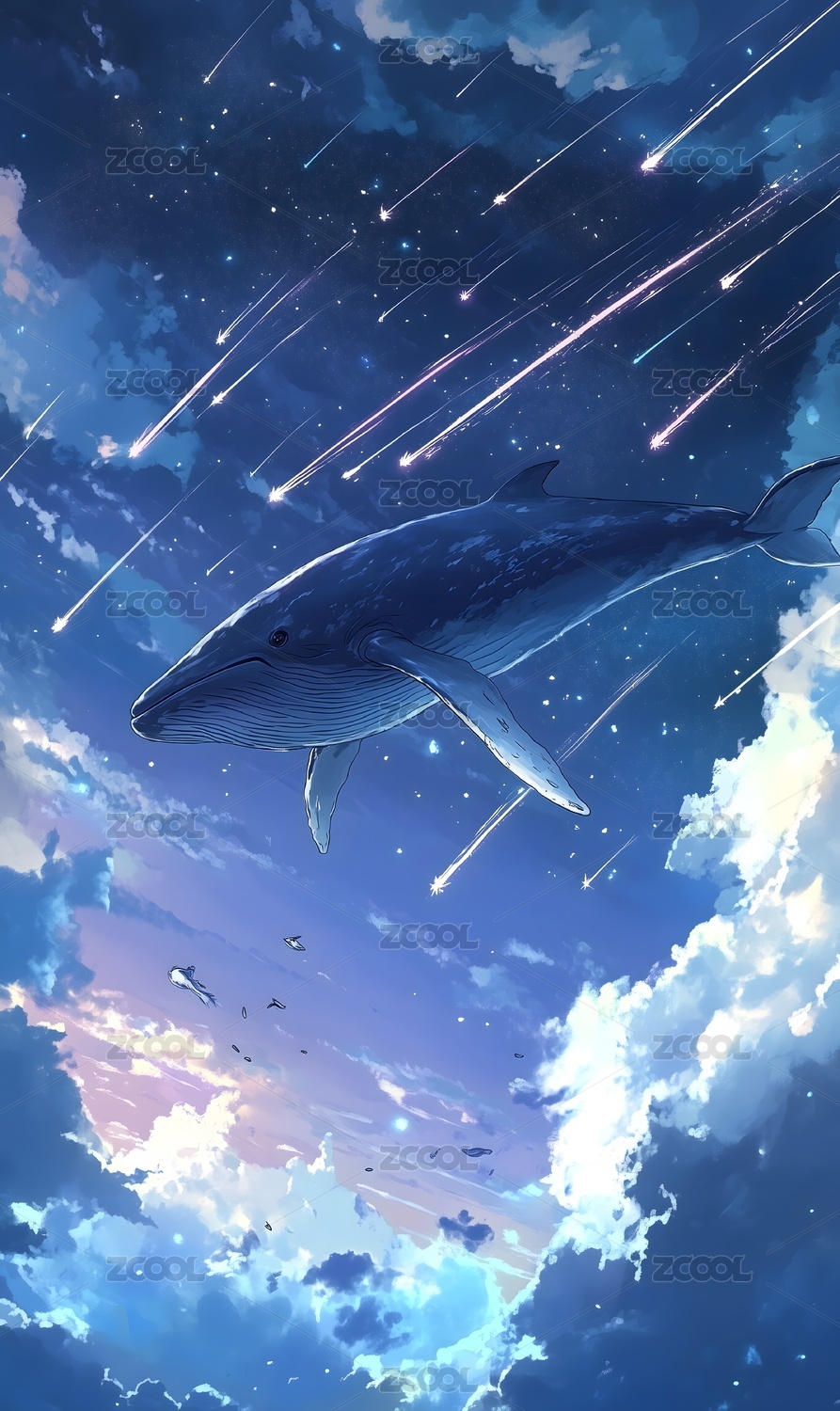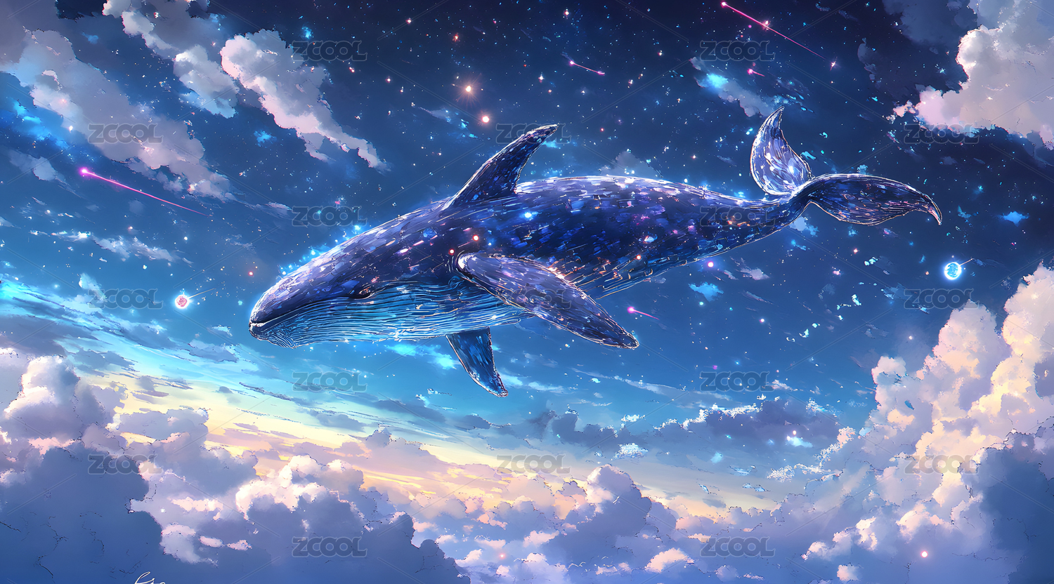 星空,夜空,云,鲸鱼,3D,插画,背景
