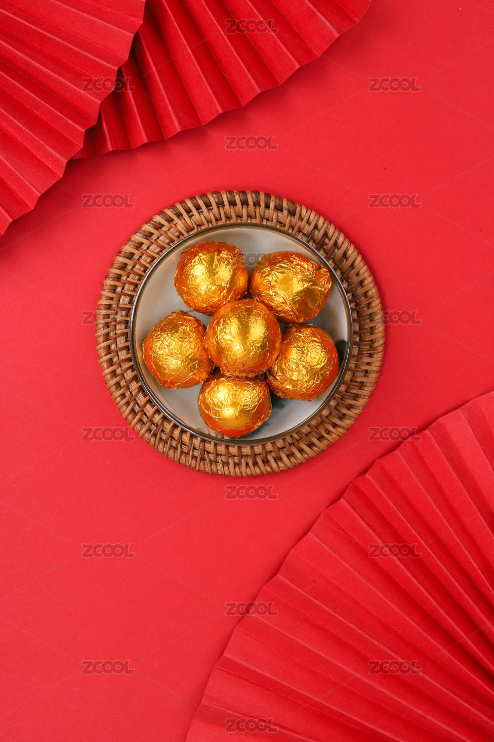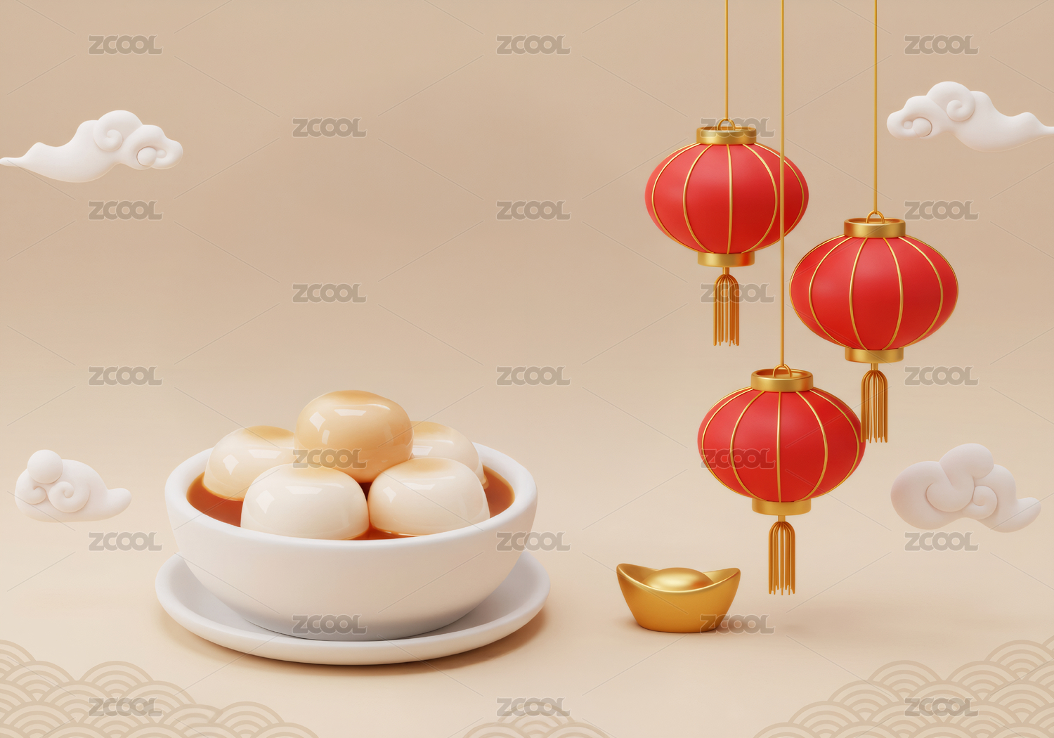 红色背景下的金色汤圆与灯笼