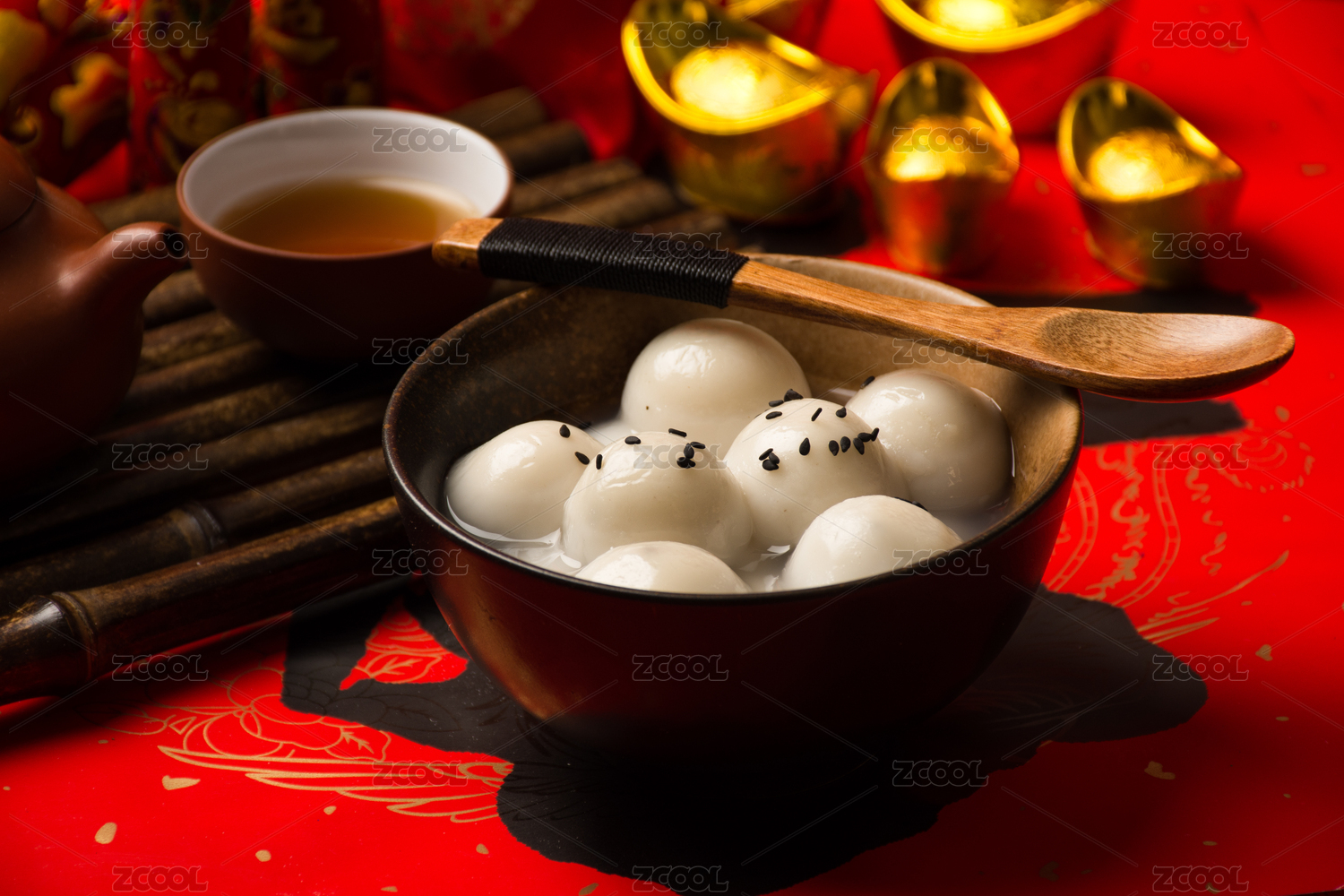 元宵节美食元宵汤圆特写红色洒金背景