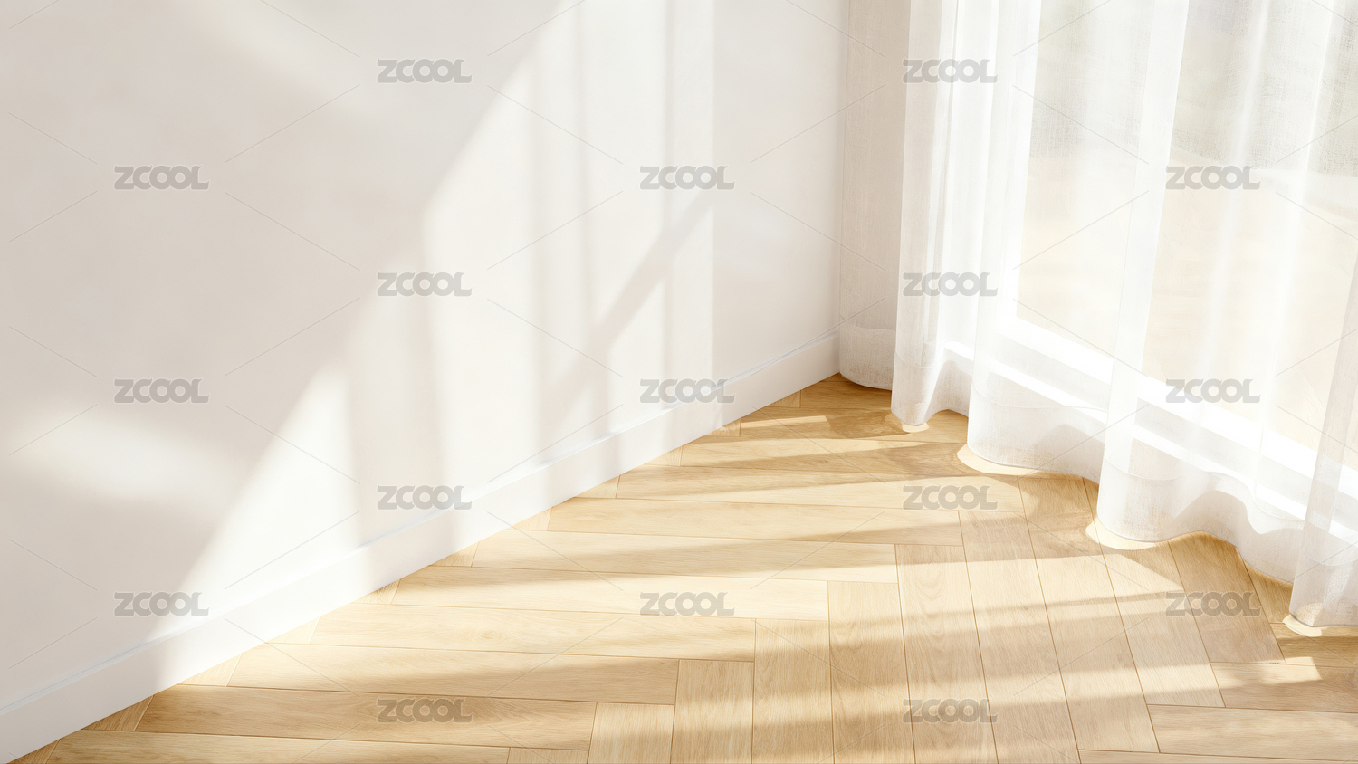 角落里,窗帘旁边,木纹地板上的地毯特写
