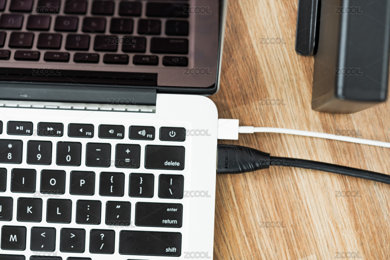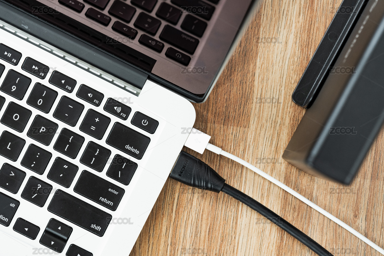 木桌桌面上的电脑连接线缆
