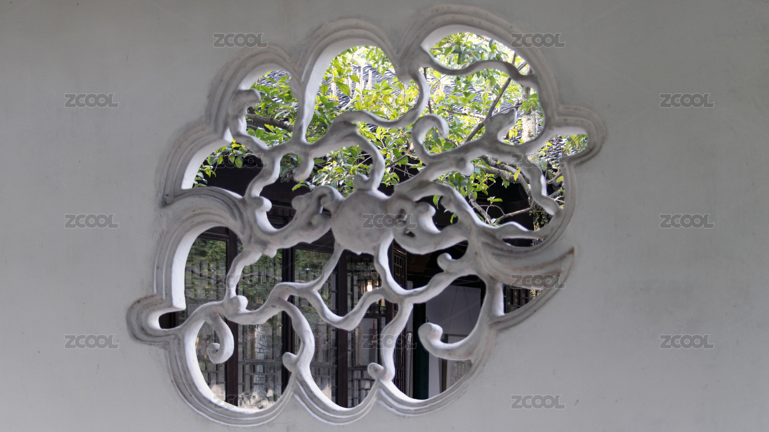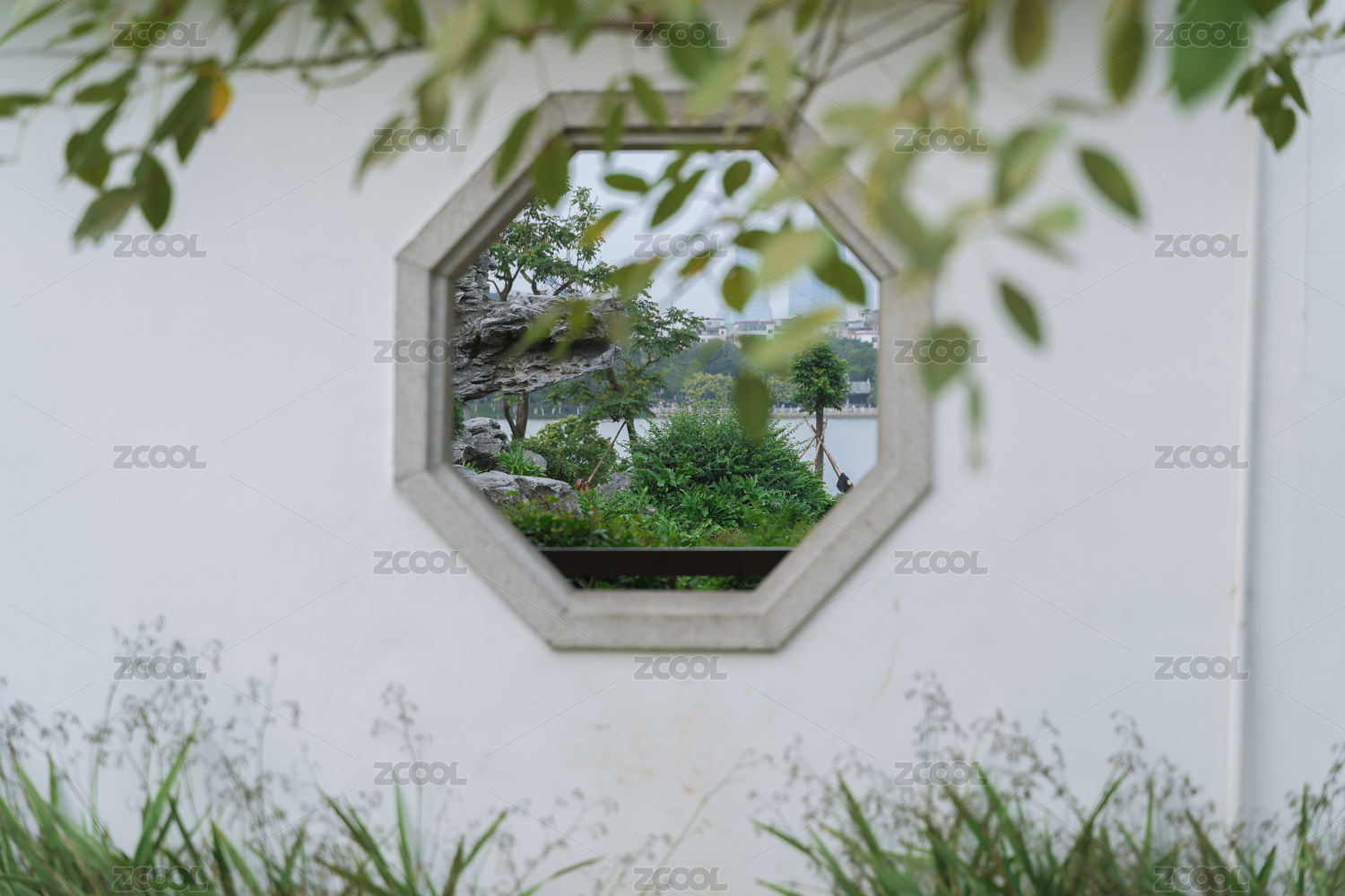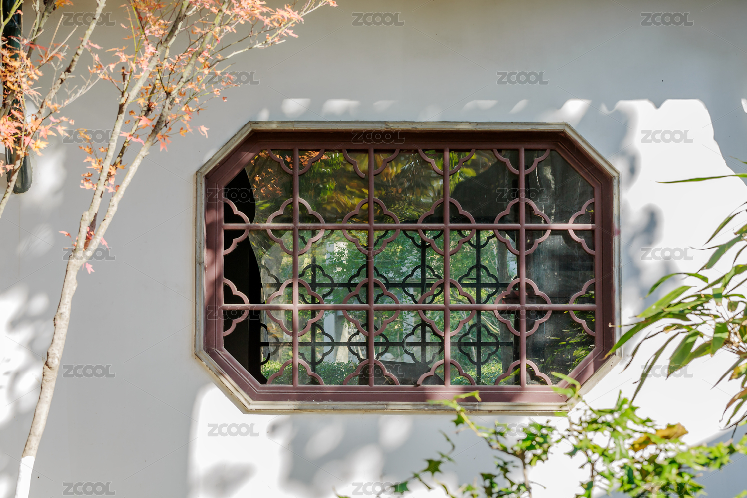 中国浙江杭州郭庄方形窗外的中式建筑景观
