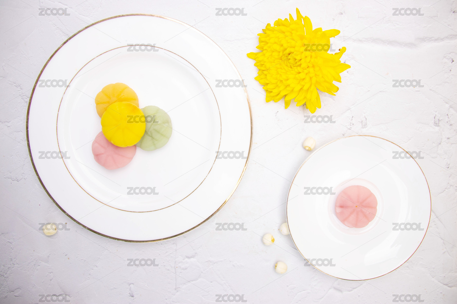 中国中秋节的彩色月饼放在黑色瓷盘中