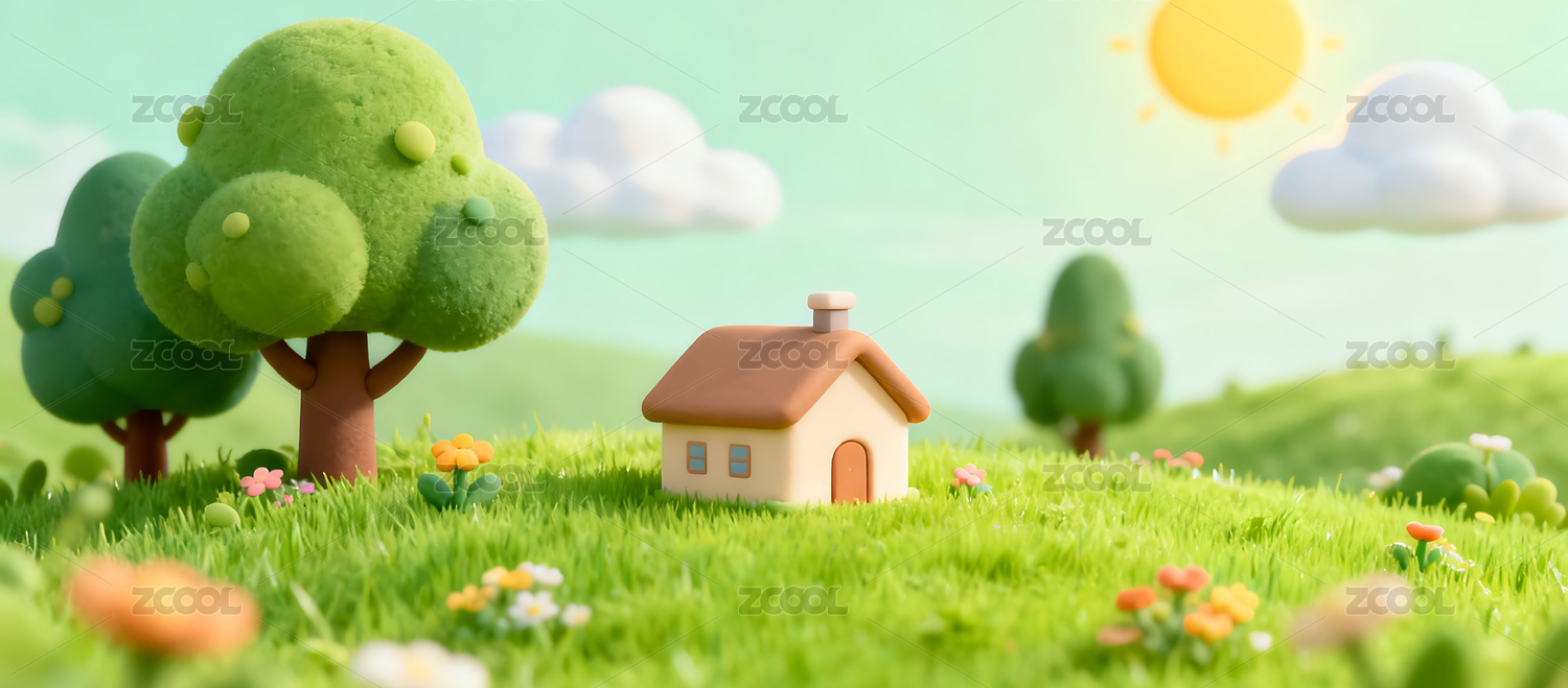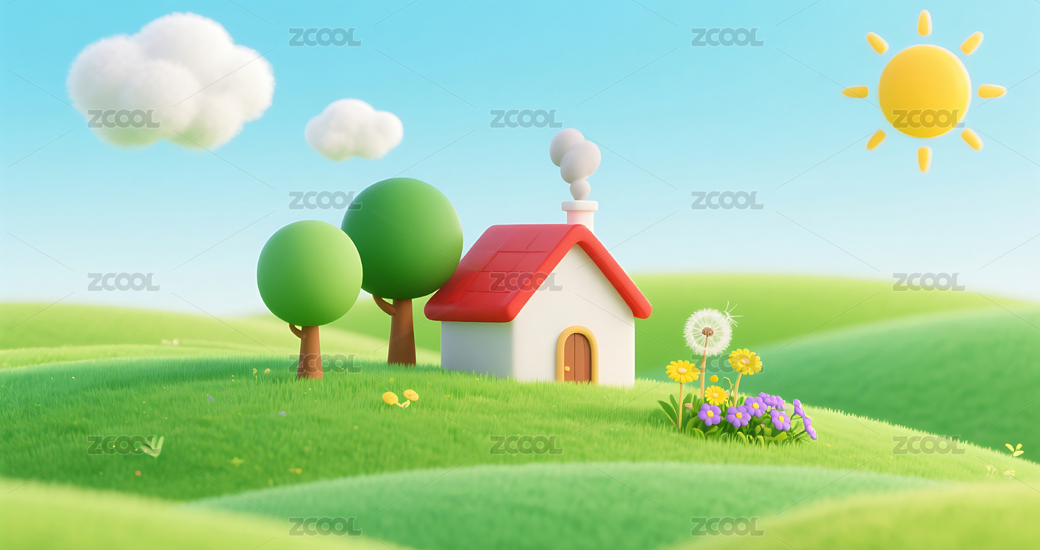 草地木屋卡通3D
