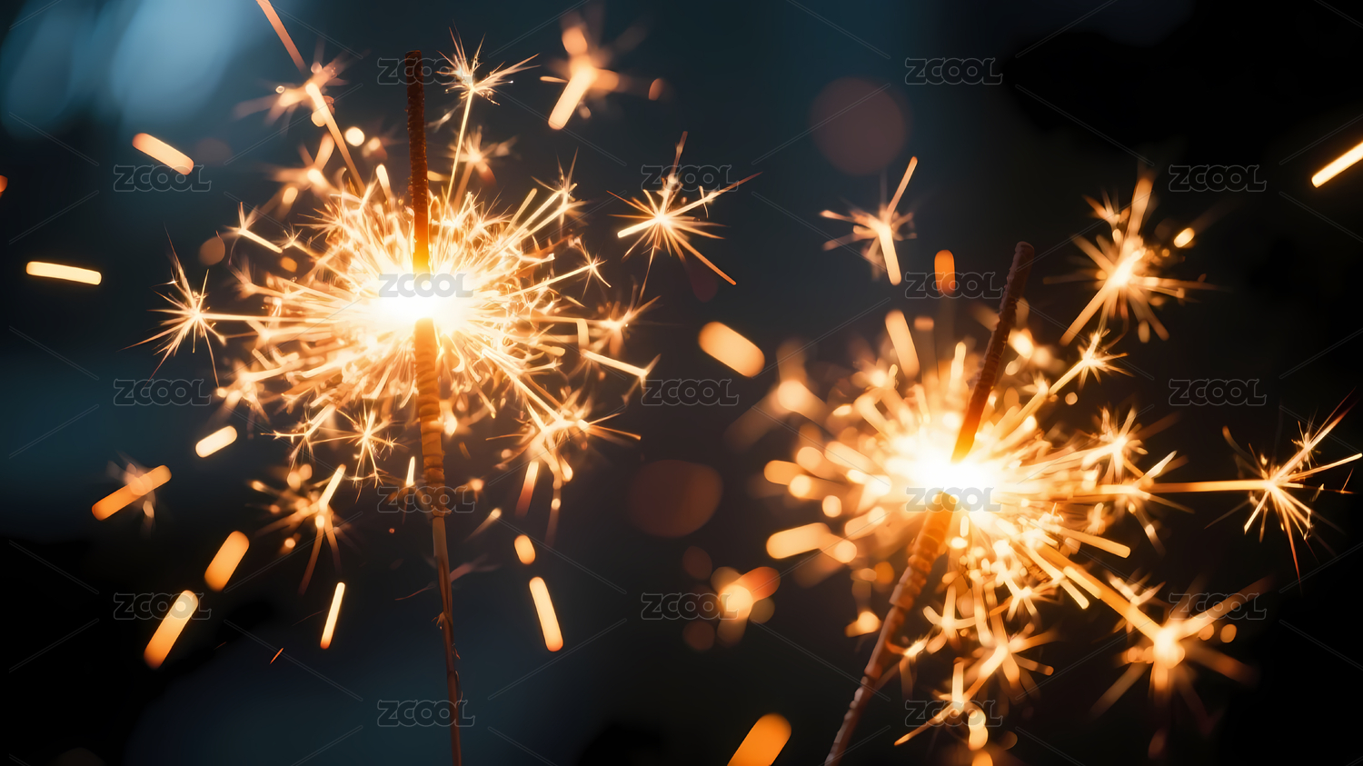 蓝色夜幕下仙女棒烟花燃烧发光瞬间