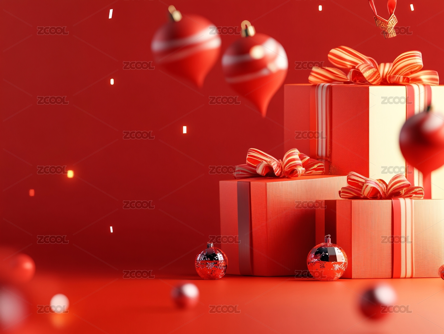 红色背景上礼盒和装饰彩球