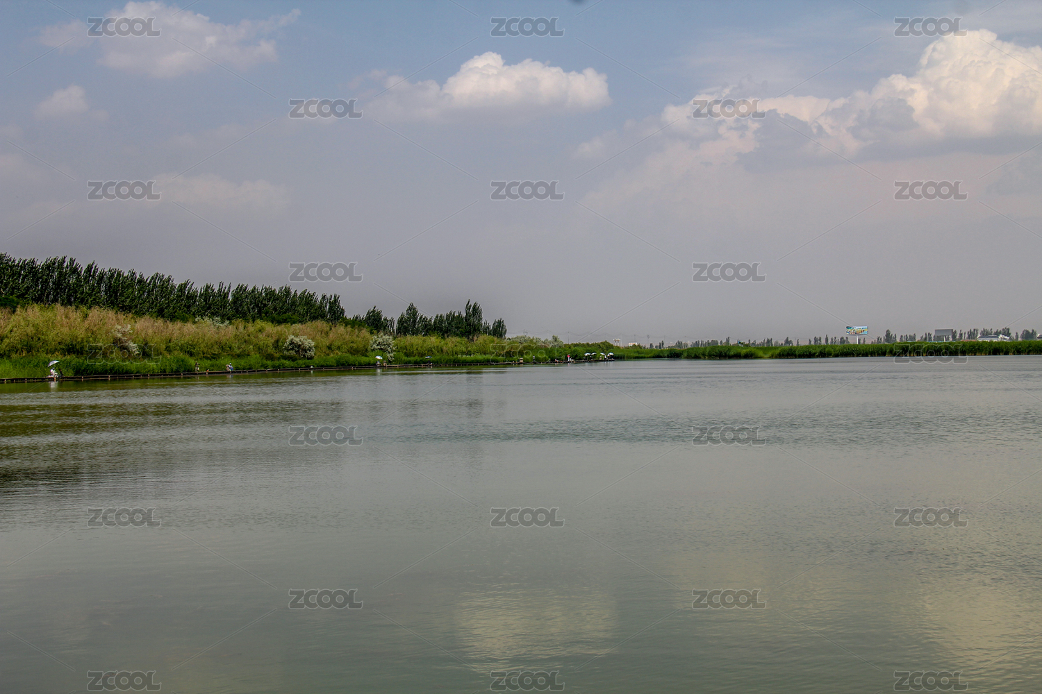 晴天里中国微山湖上的湖面和远处的芦苇荡湿地