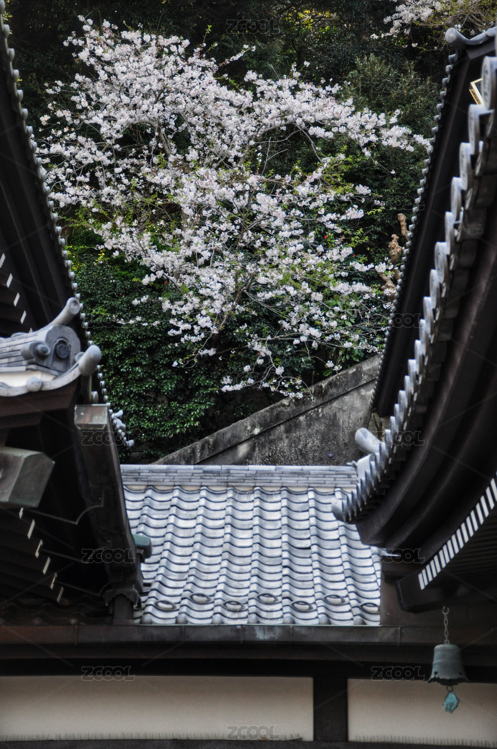 日本京都春天樱花掩映中的清水寺寺庙一角特写