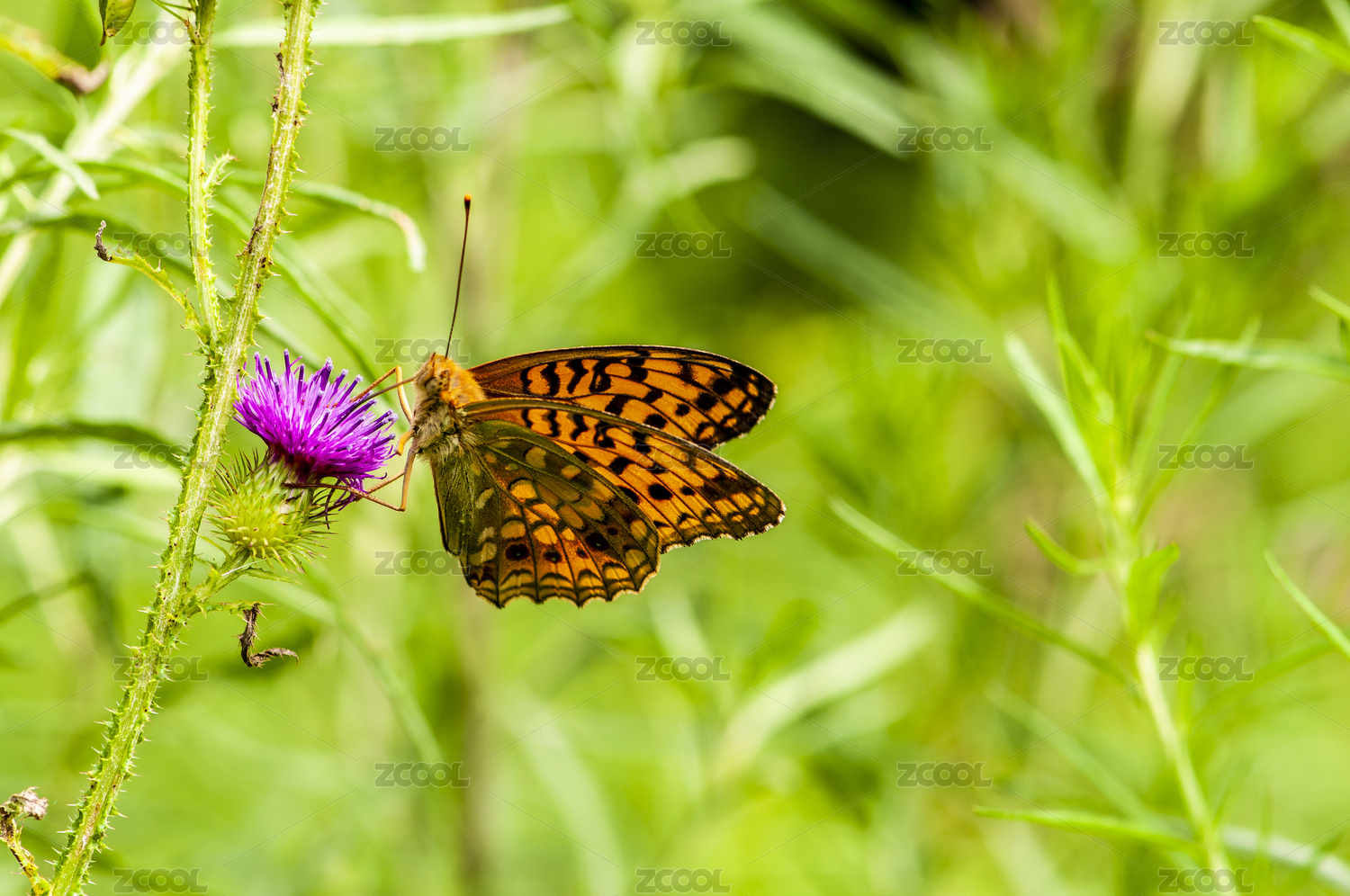 一只吸食花蜜的绿豹蛱蝶
