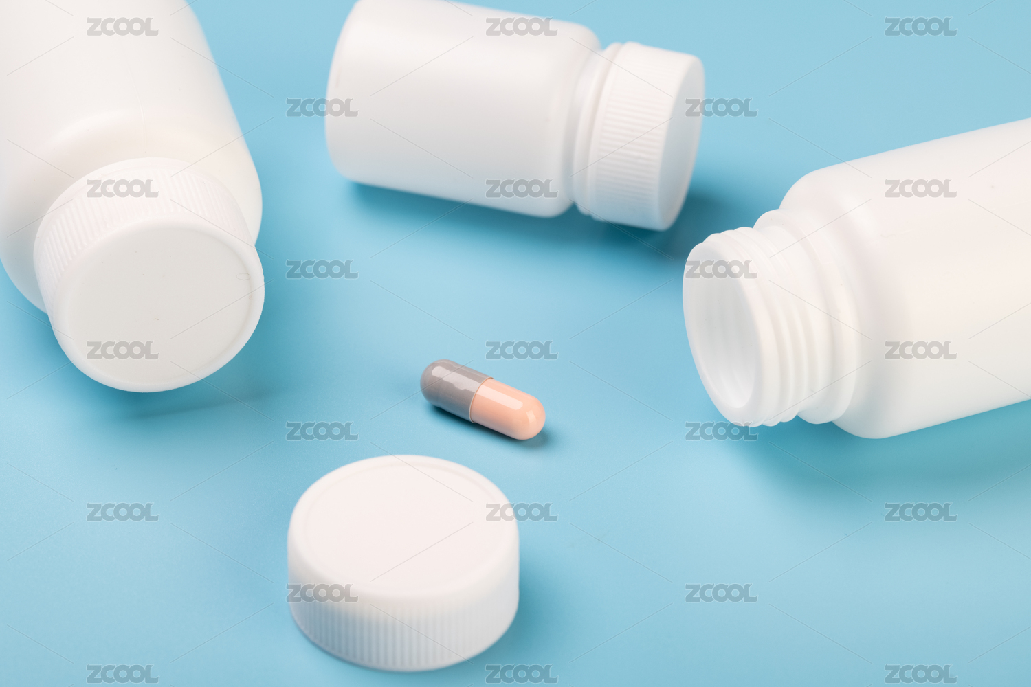 白背景下的药片、药瓶和胶囊——按时吃药概念图片