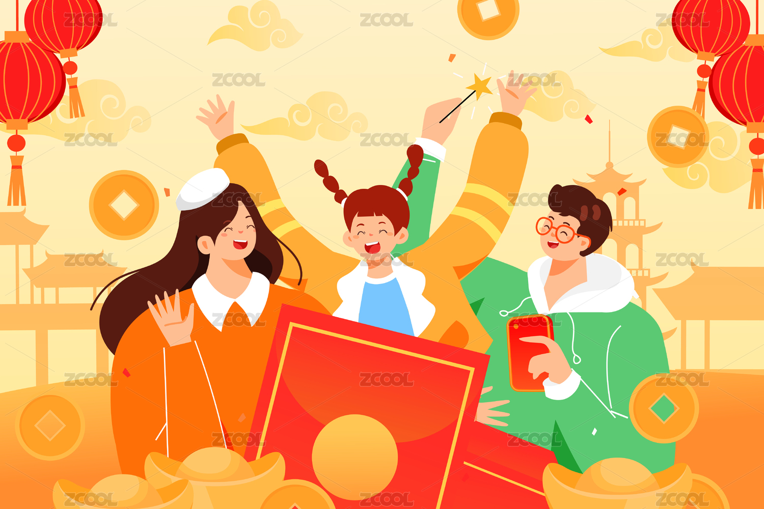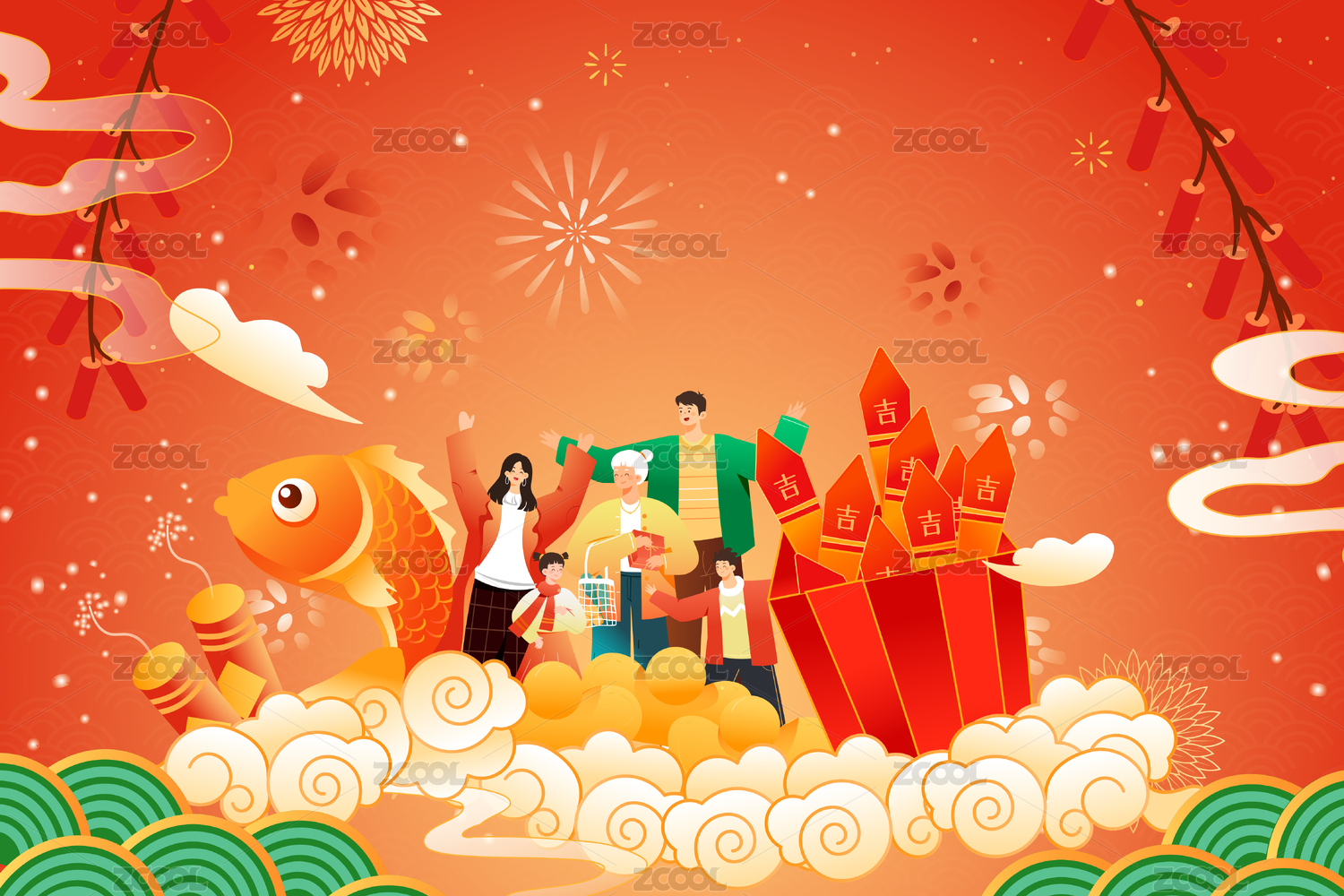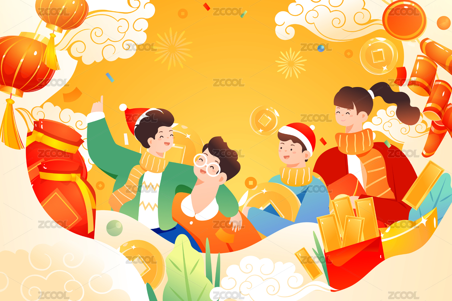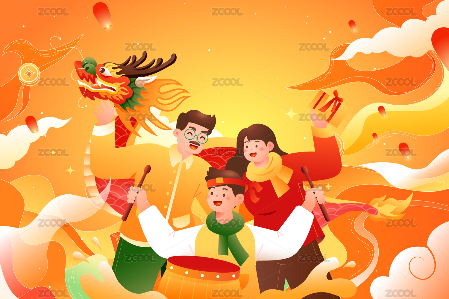 新春龙年过年人物传统喜庆矢量插画素材背景