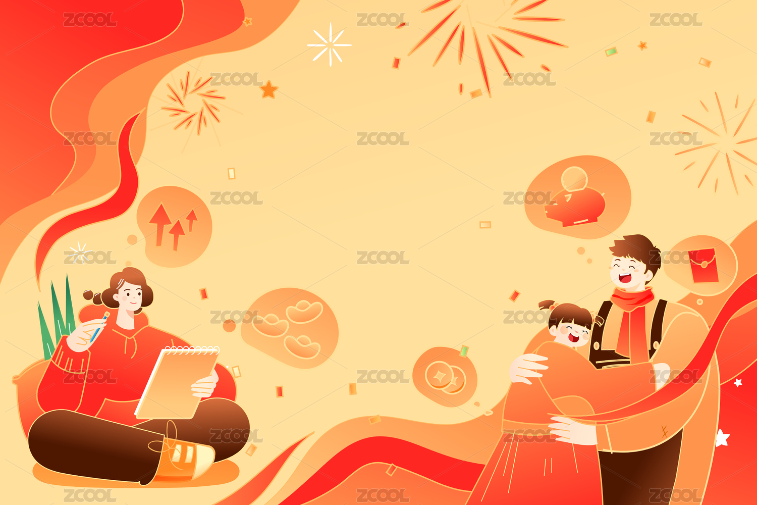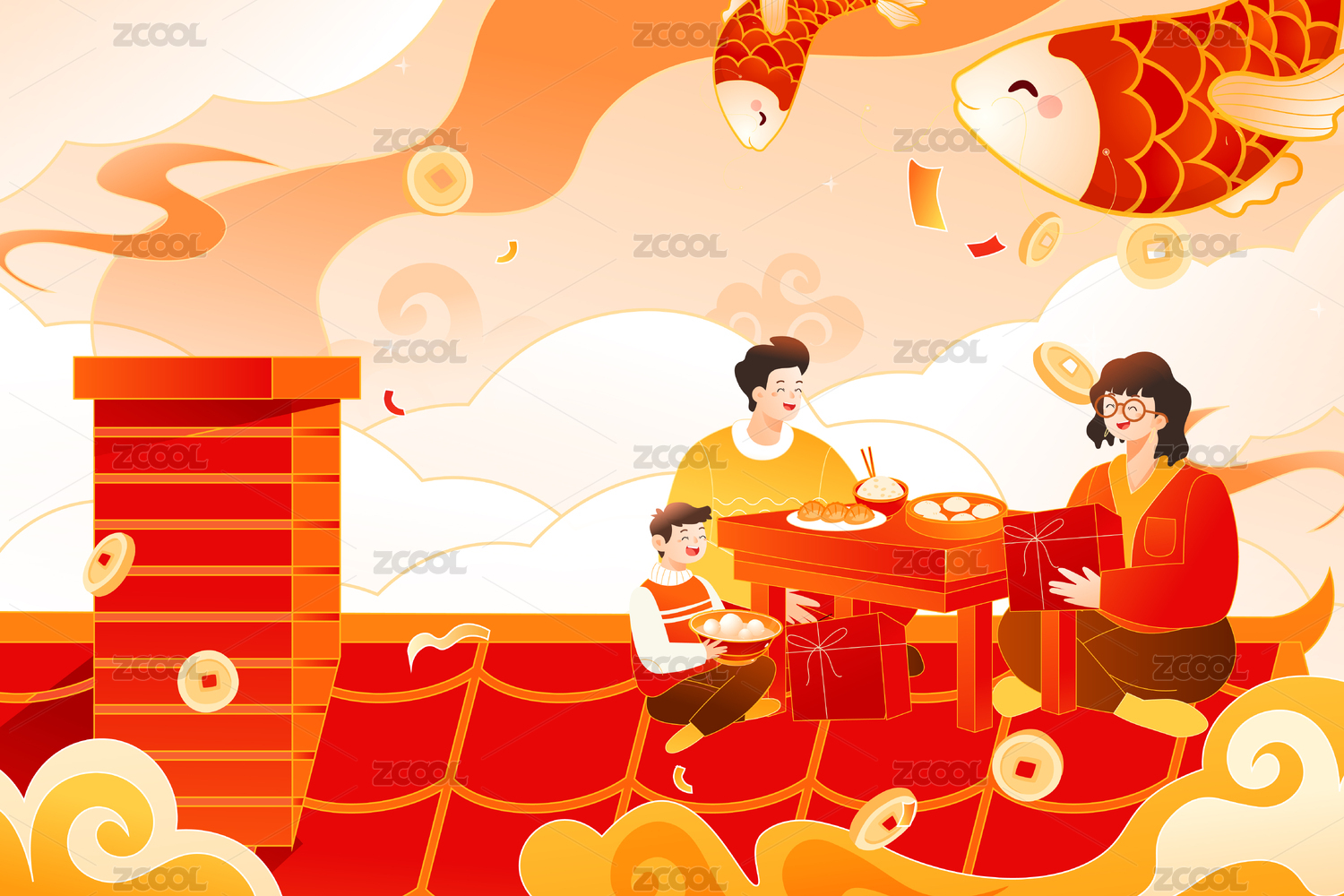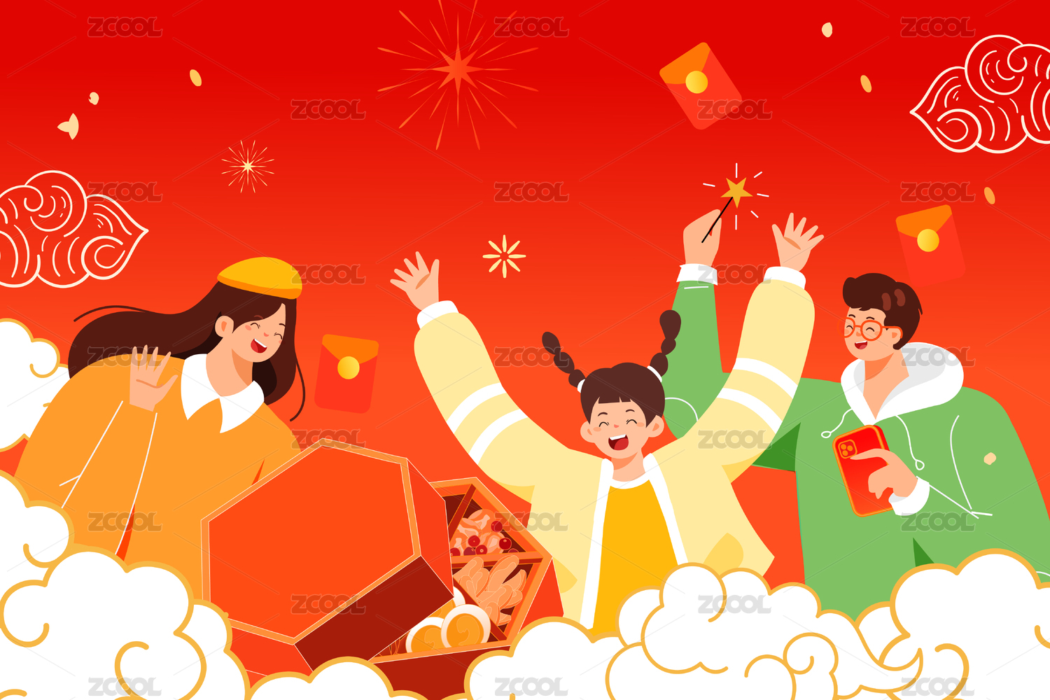 新春龙年过年人物传统喜庆矢量插画素材背景