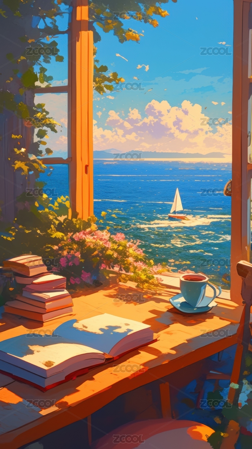 窗边阅读海景帆船