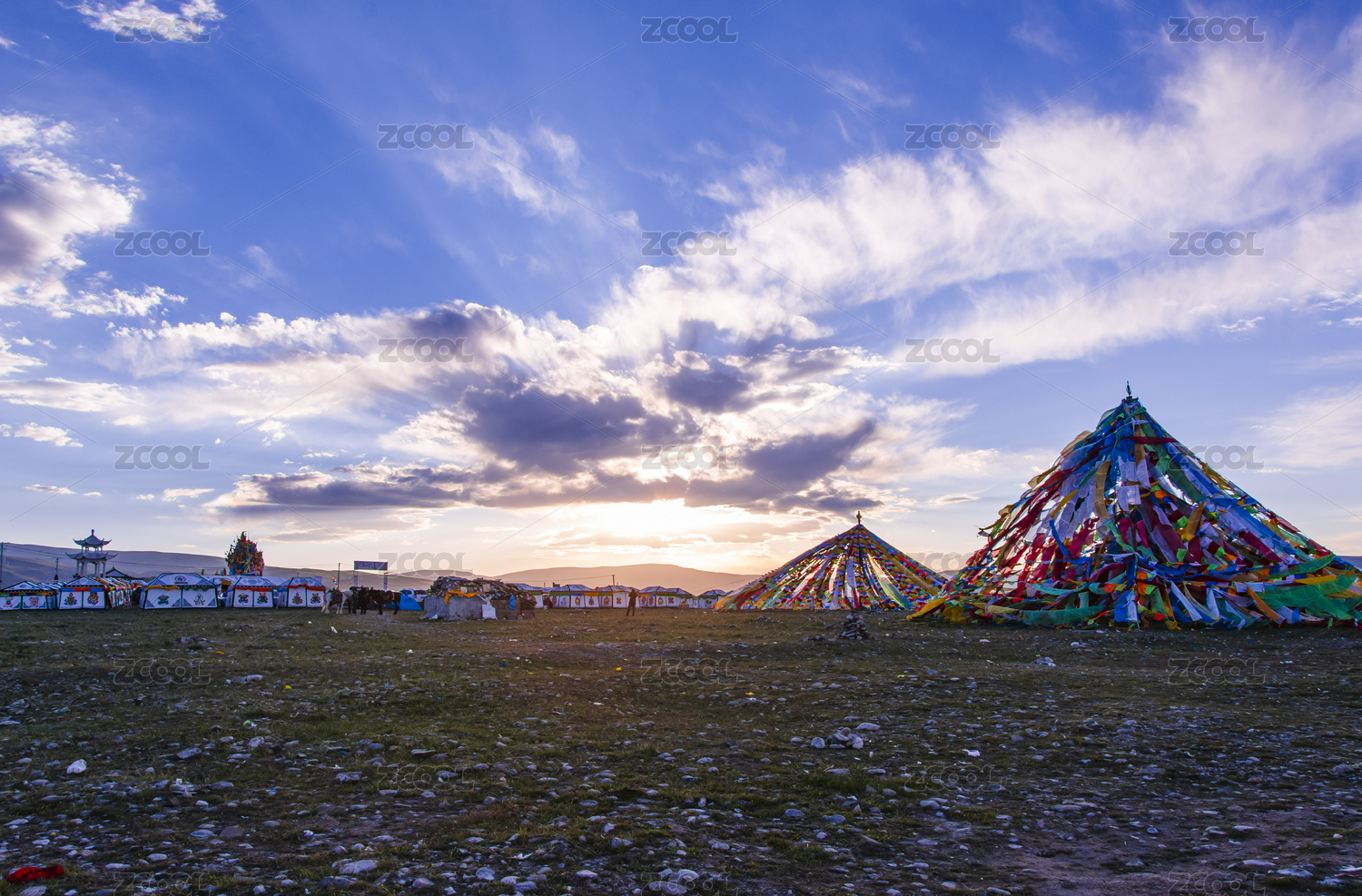 青海省海北市金银滩草原上一座藏族彩色经幡