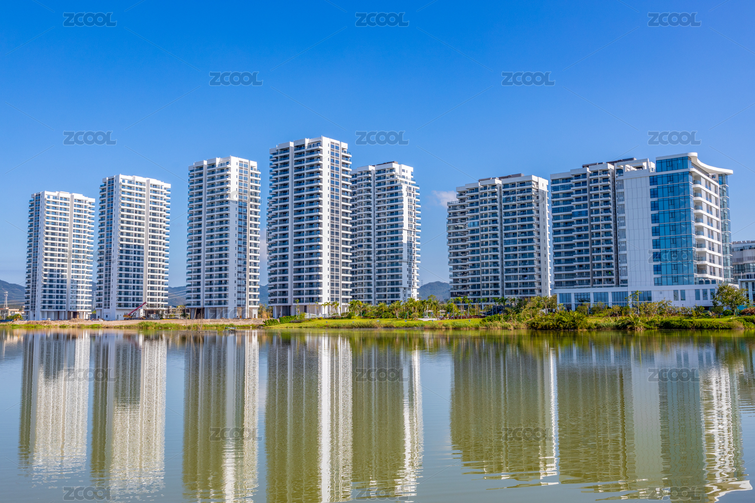 蓝色,天空,倒影,城市,建筑,住宅,高层建筑,晴朗,平静,水面