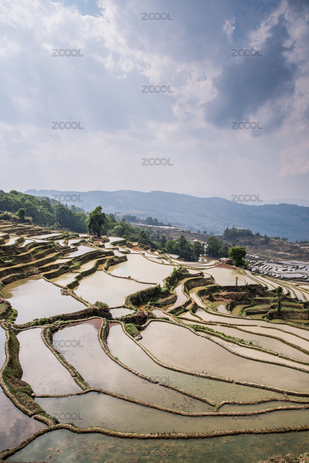 春季里永定初溪灌满水等待耕种的梯田,中国福建龙岩