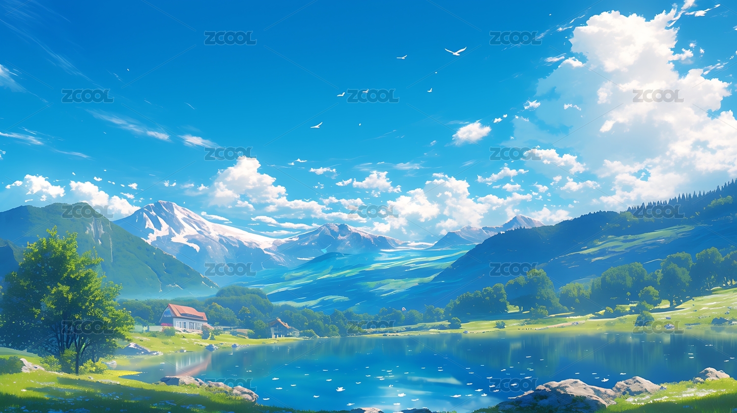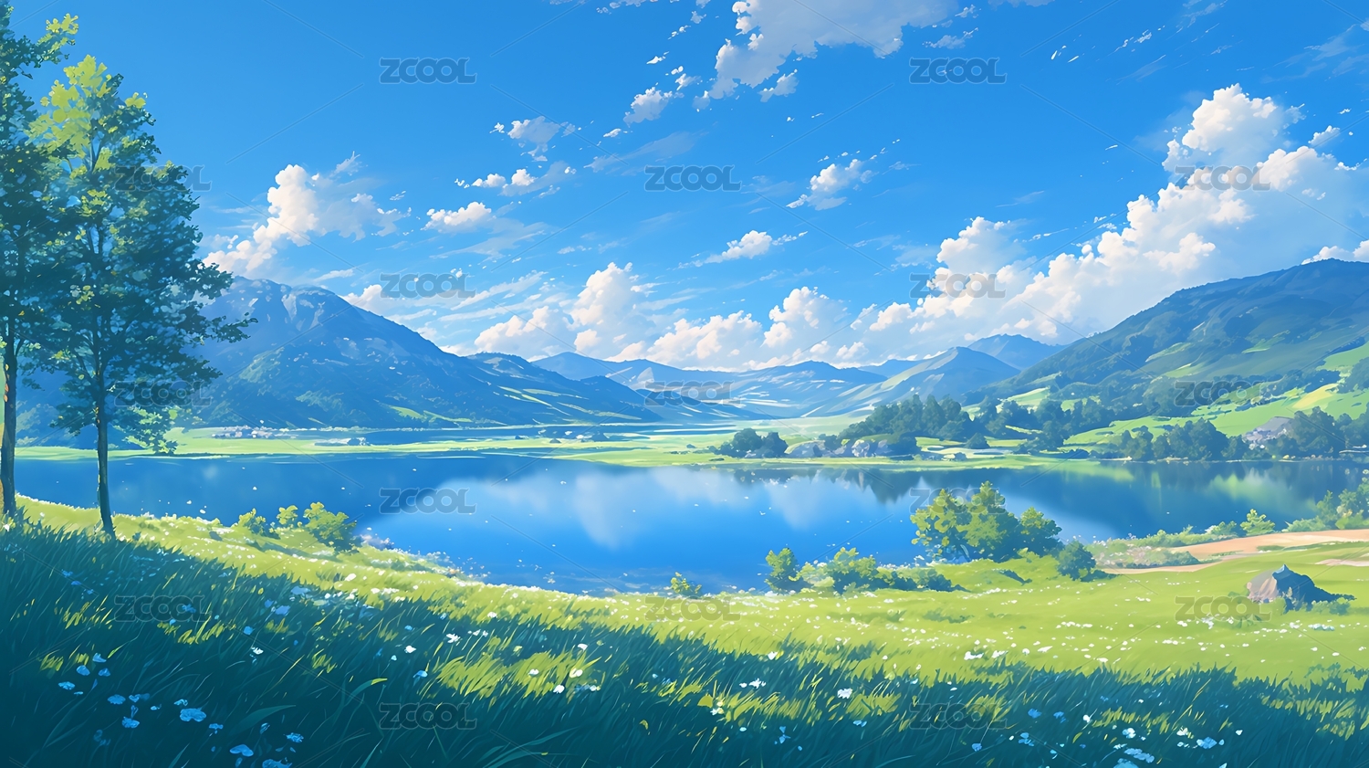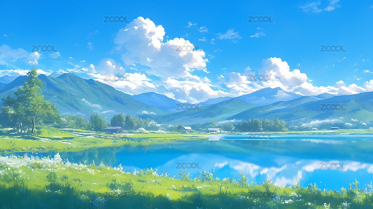 风景,阳光,蓝天,白云,壁纸,湖泊,河流,插画