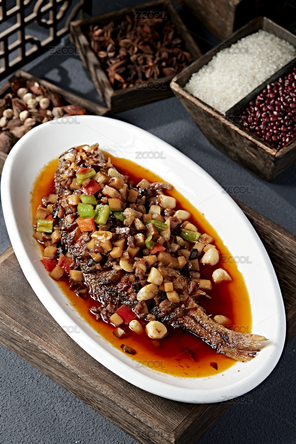 白色圆盘装的红烧罗非鱼摆放在樟木砧板上