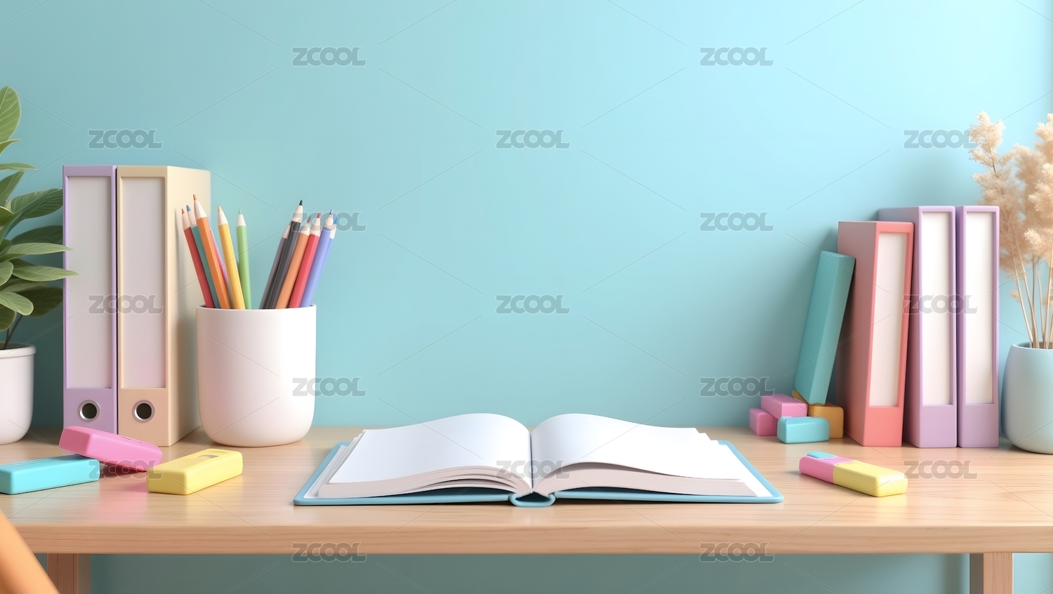 叠起的书籍笔筒铅笔学生文具,教育主题背景