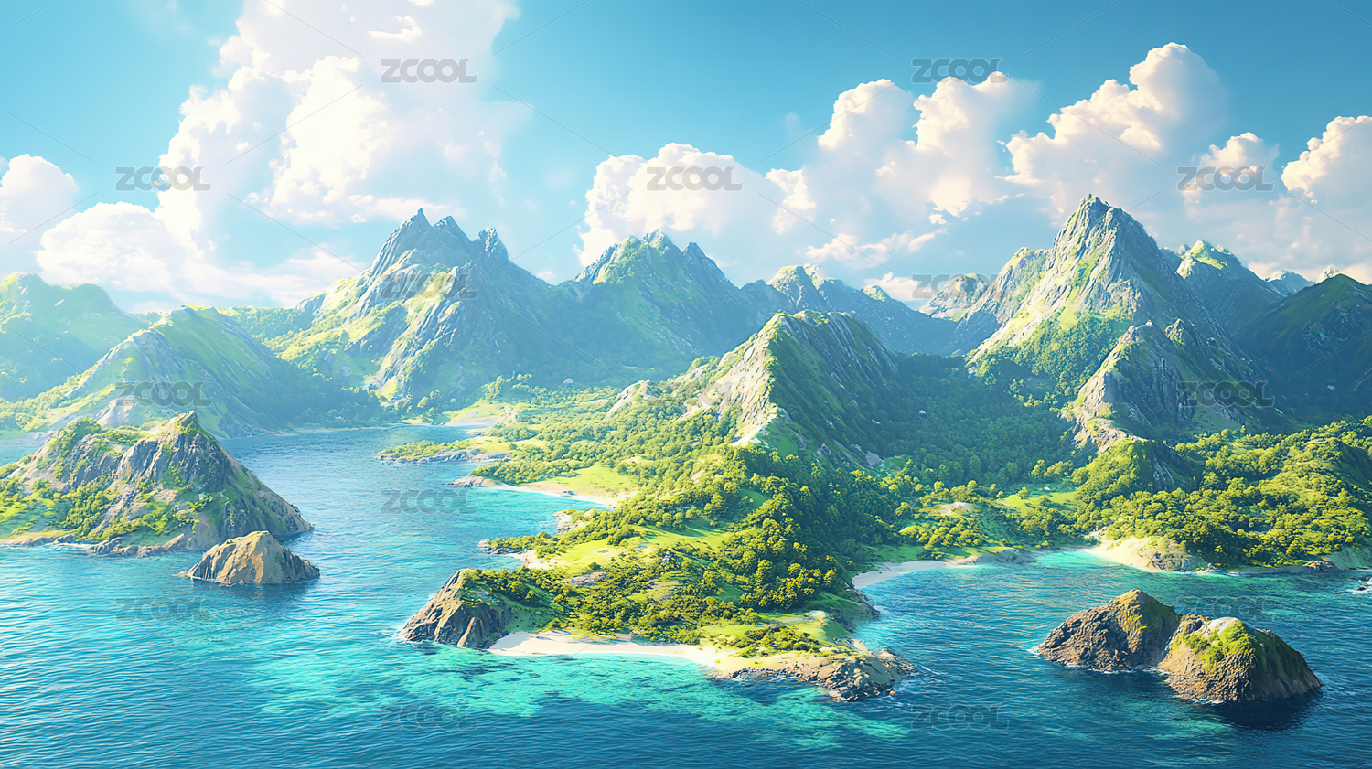 热带岛屿鸟瞰图,山脉环绕,碧海蓝天