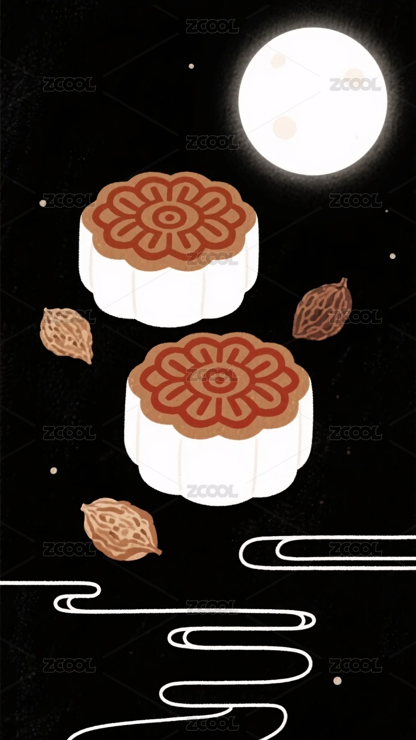 月夜下的月饼与坚果插画