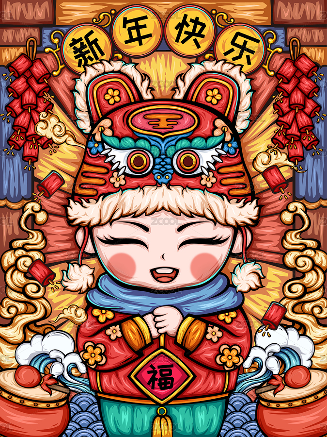 国潮,新年,鞭炮,祥云,虎头帽,矢量,福娃,云朵,云,海浪
