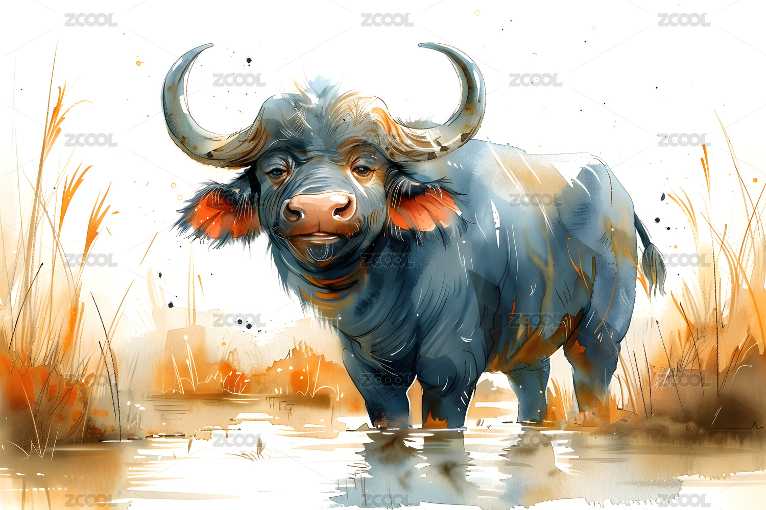 水彩插画一头水牛在池塘边