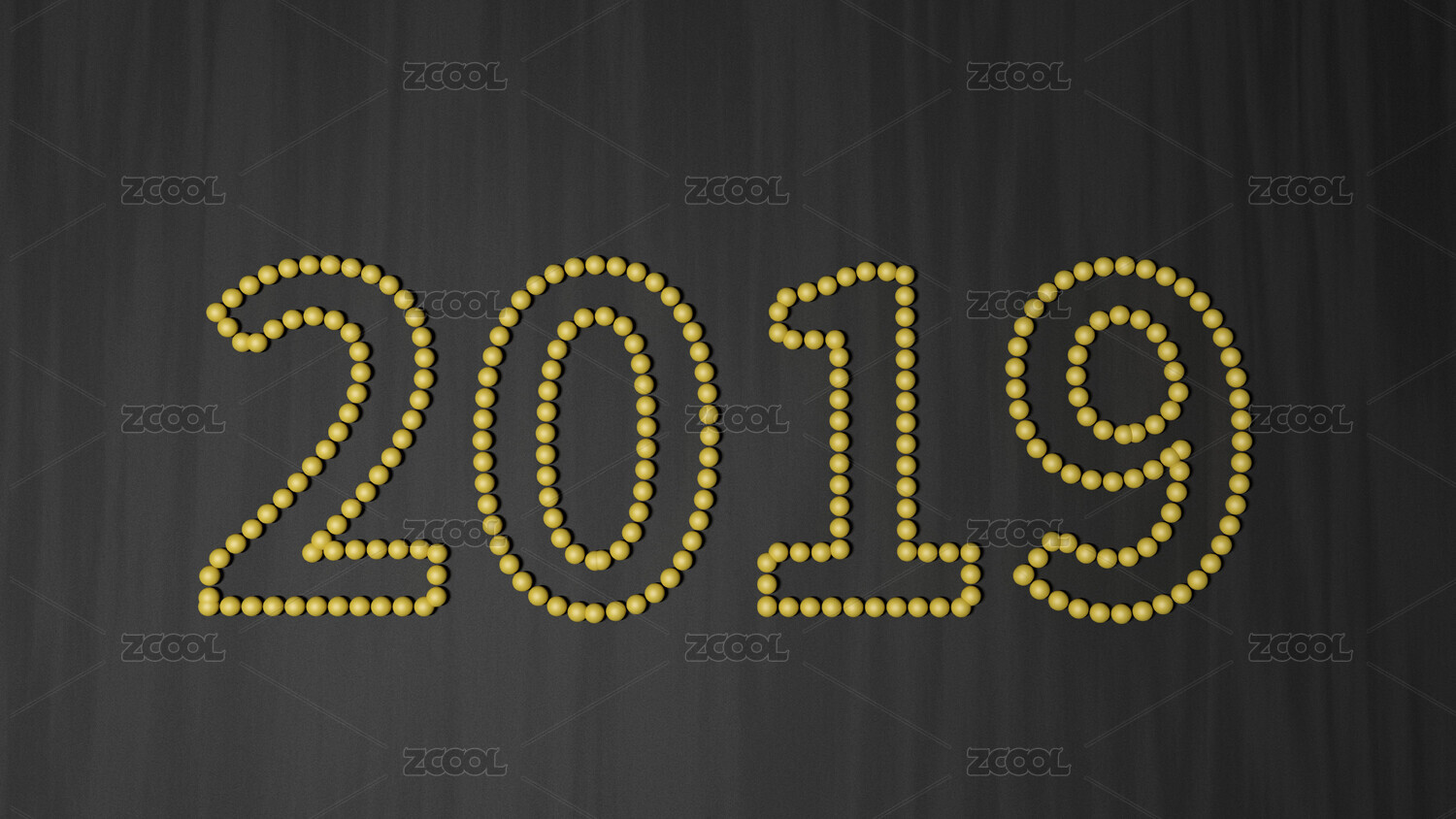 金色的2019年3d数字在黑色带有金属颗粒的创意背景上,新年快乐的概念