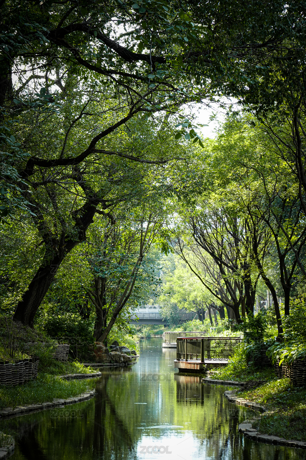 公园夏天的绿树与小溪