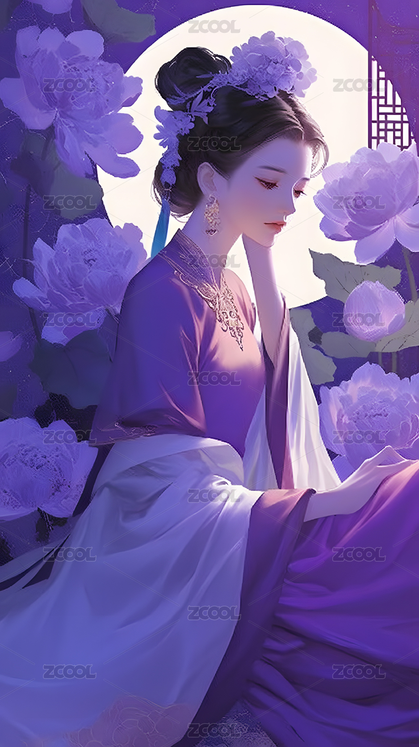 紫衣女子月下赏花