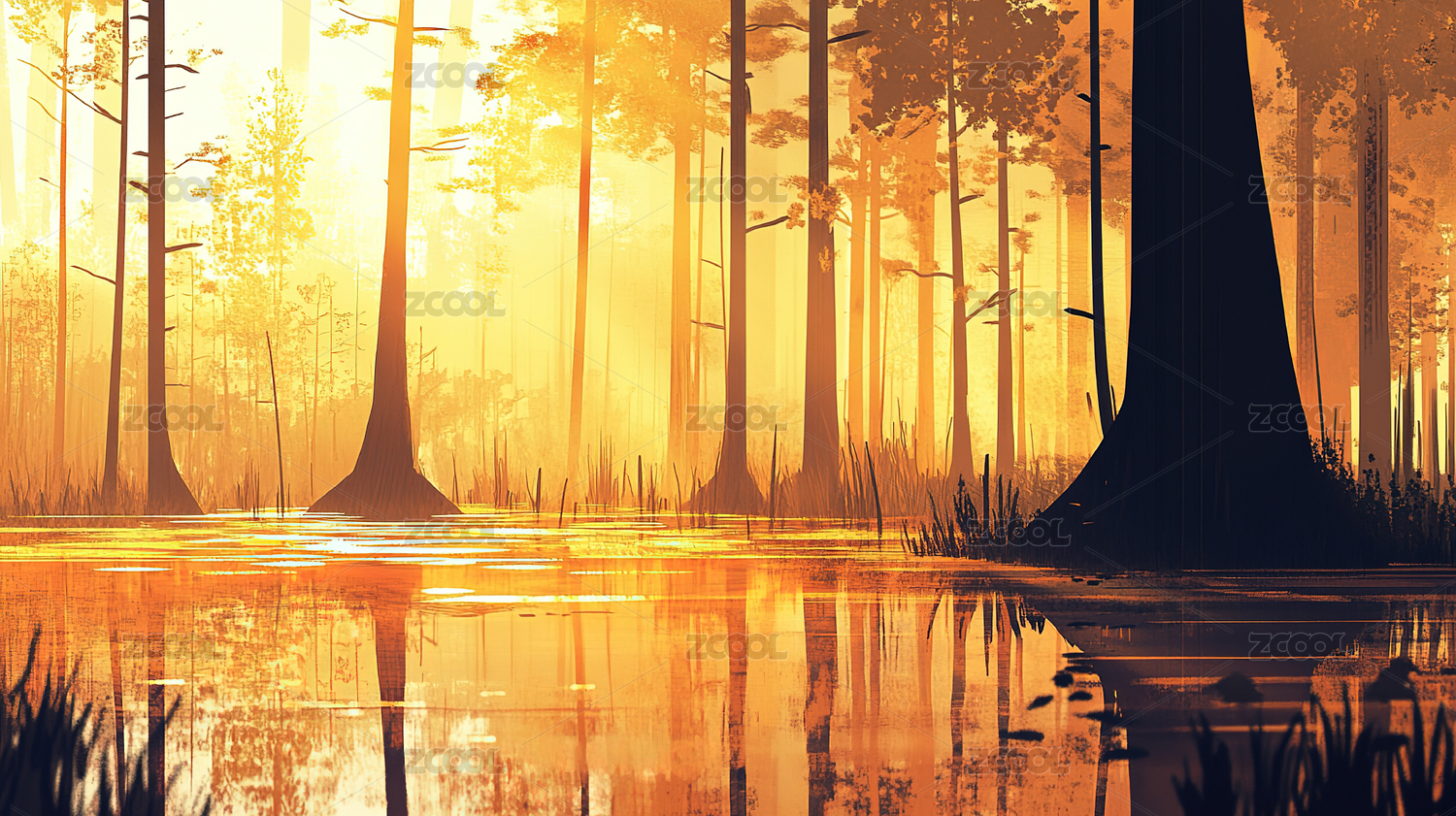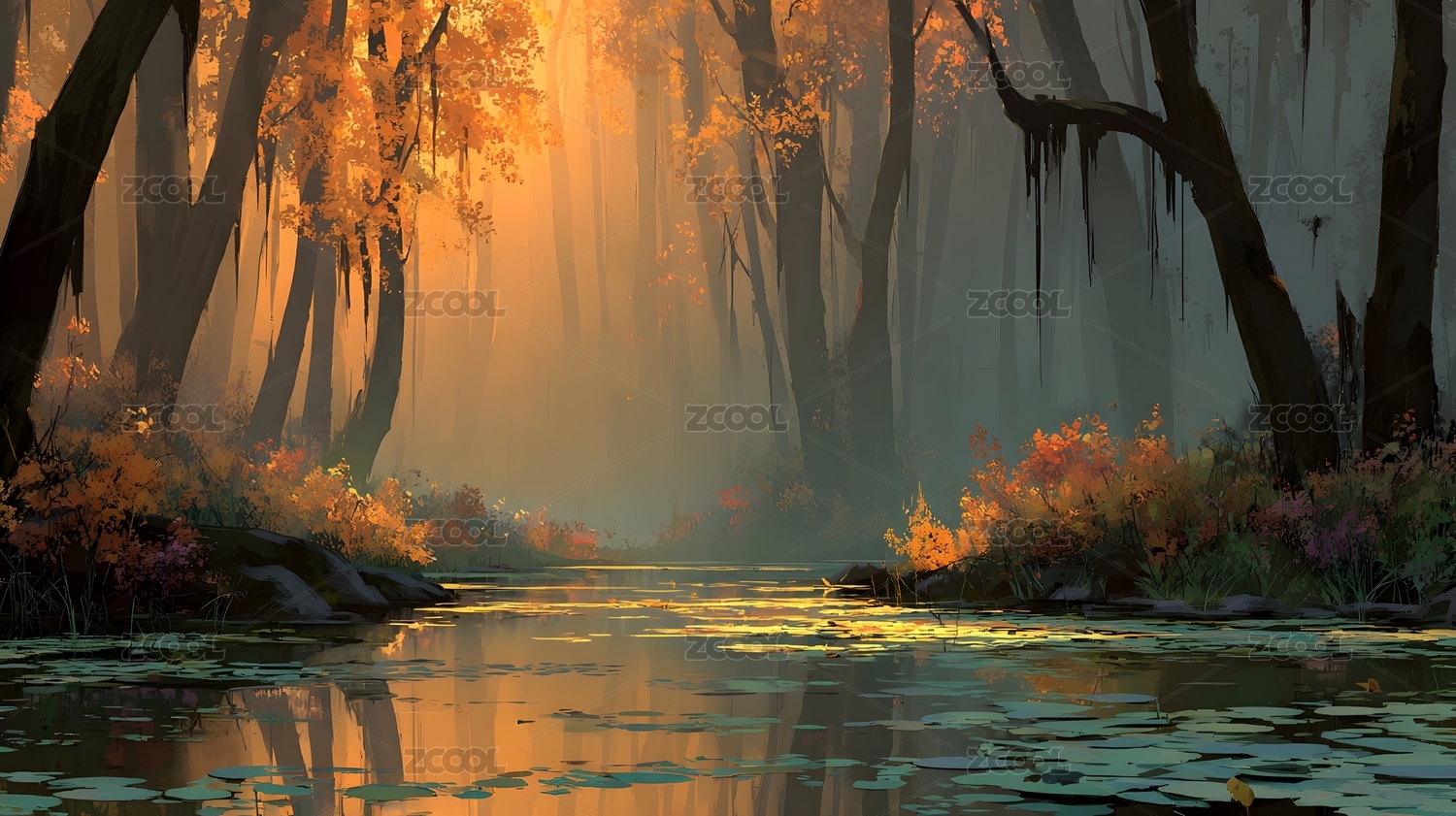 森林,池塘,金色,阳光,树木,秋天,反射,自然,美景