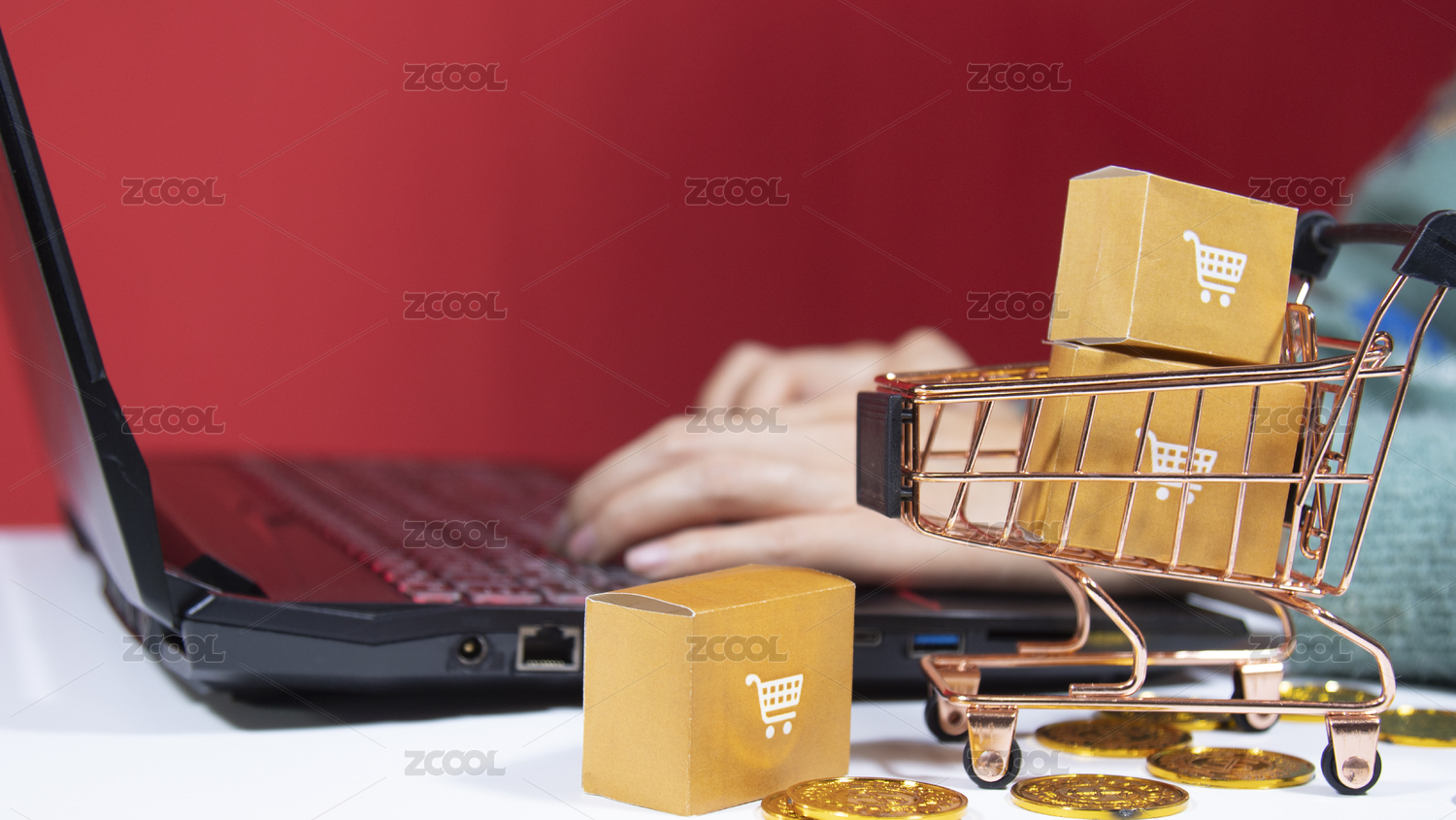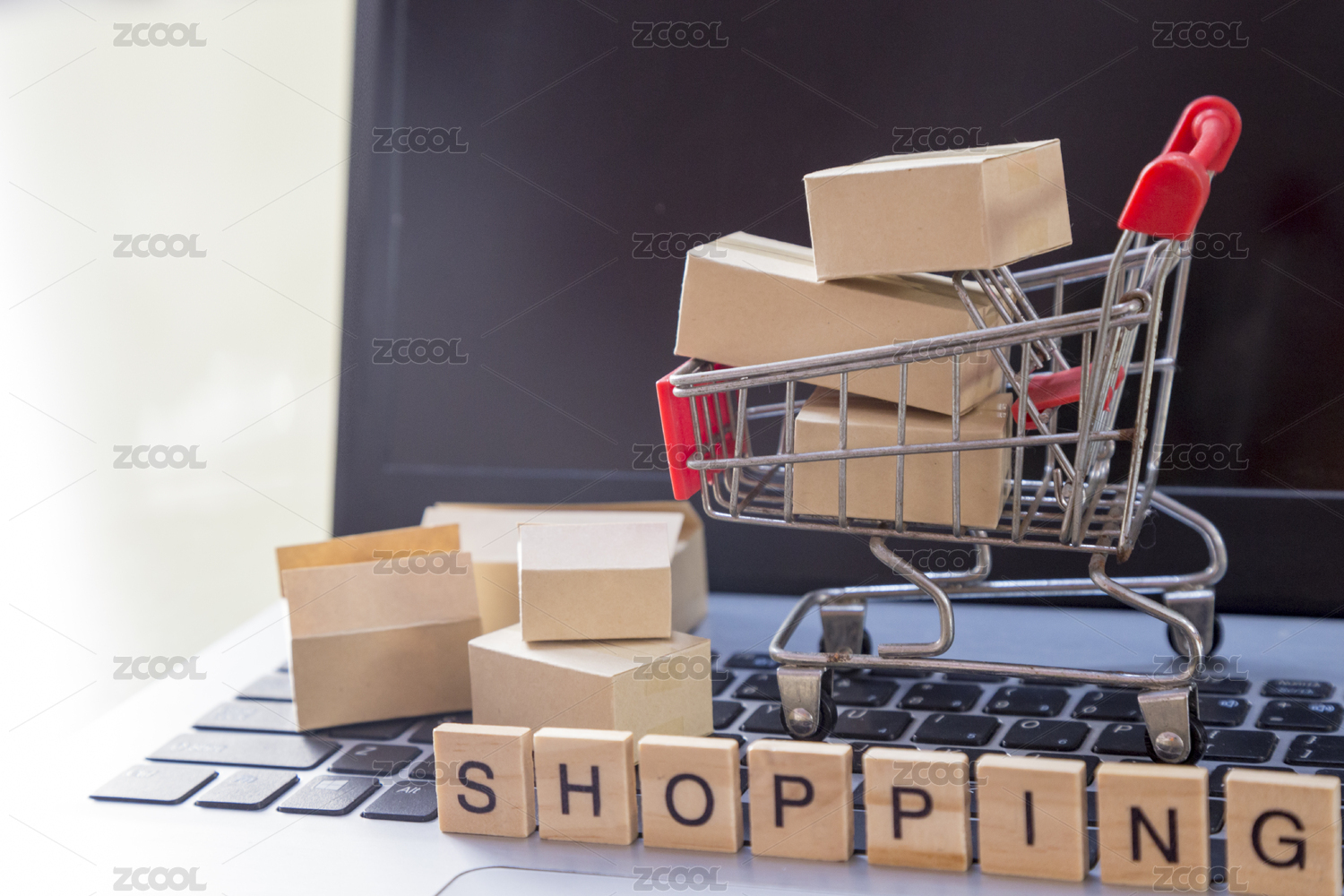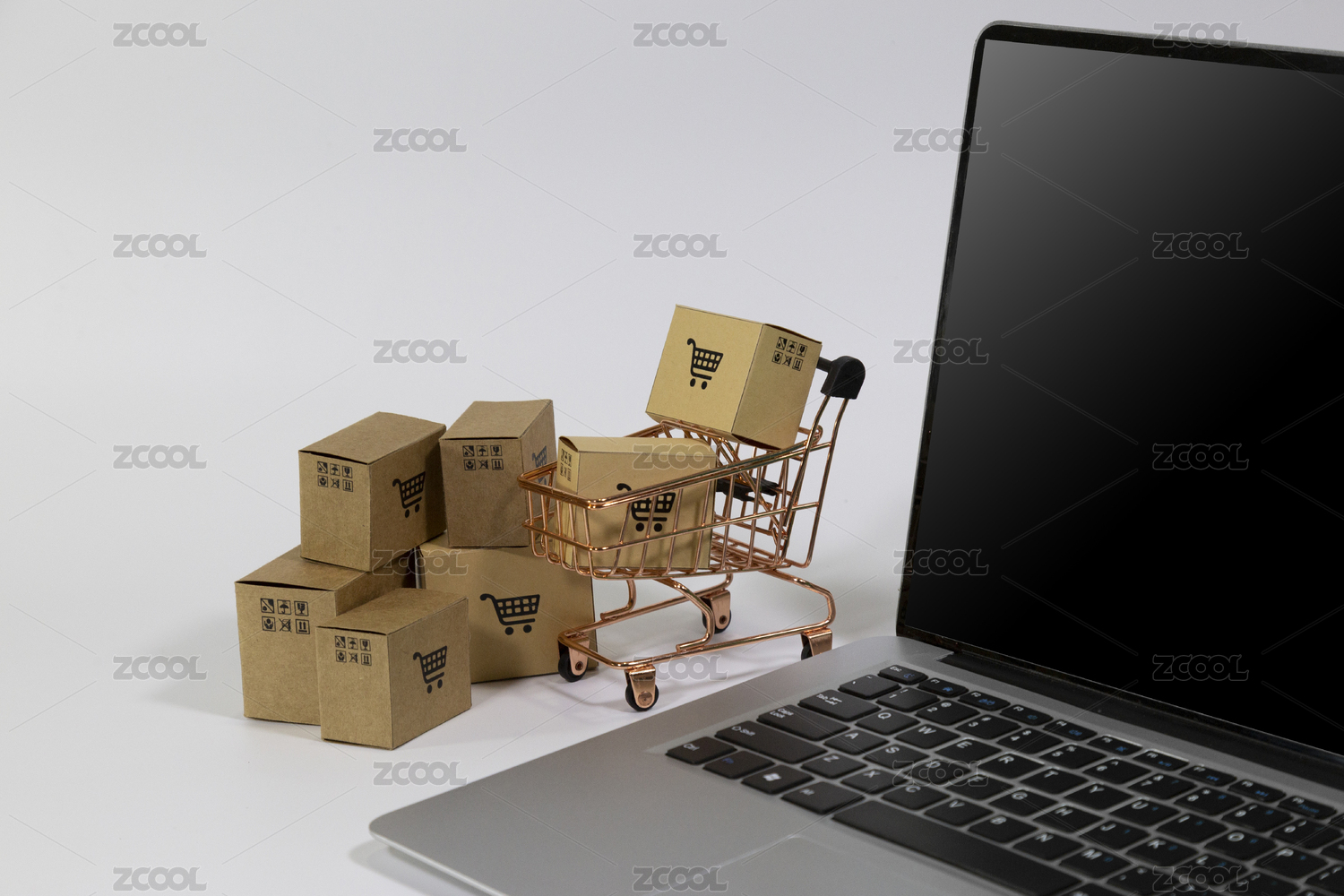 笔记本电脑背景下装满快递纸箱的购物车