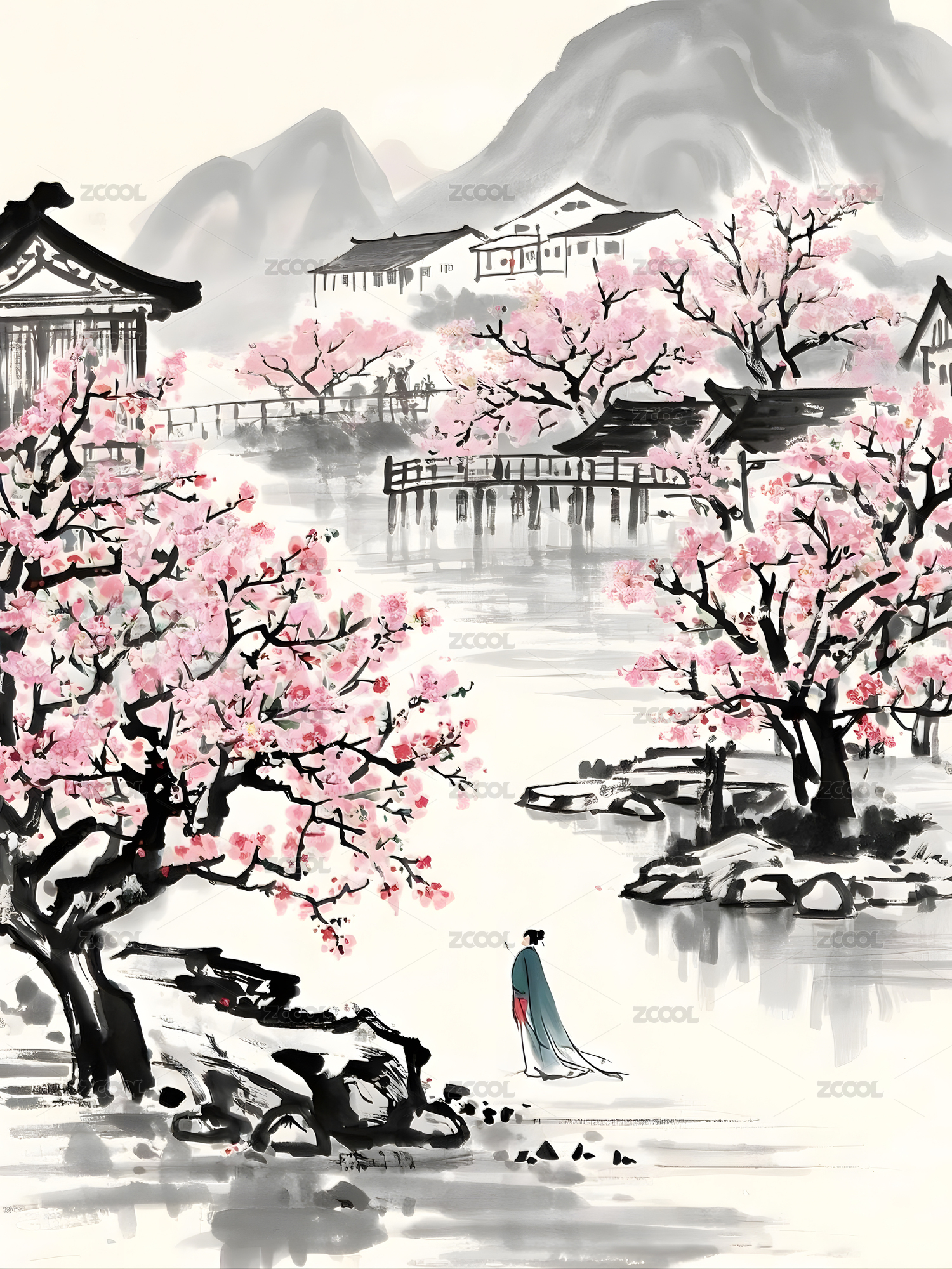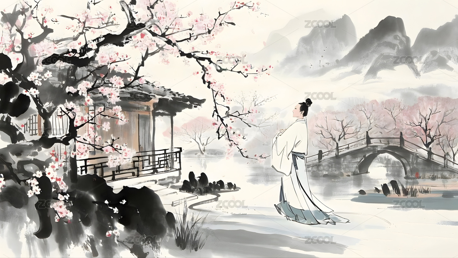 水墨江南女子赏樱图