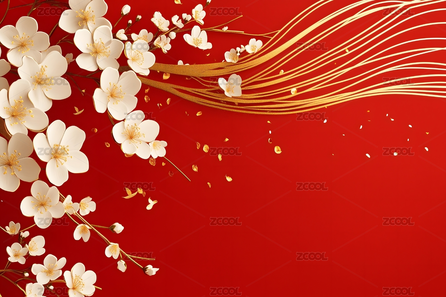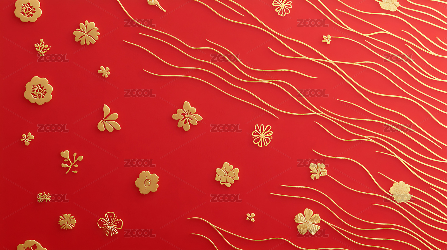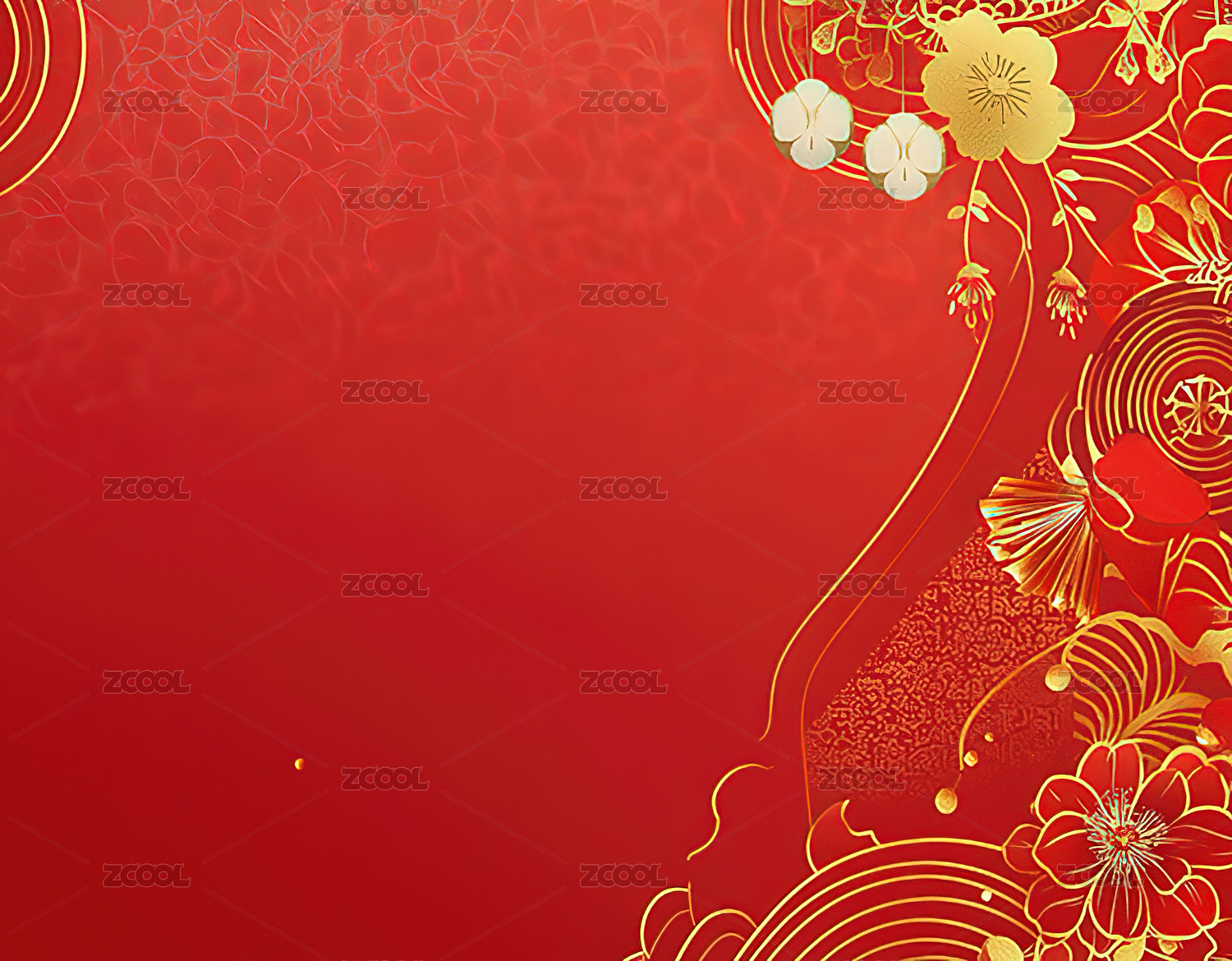 红色背景下,金色元宝和装饰灯笼的节日景象