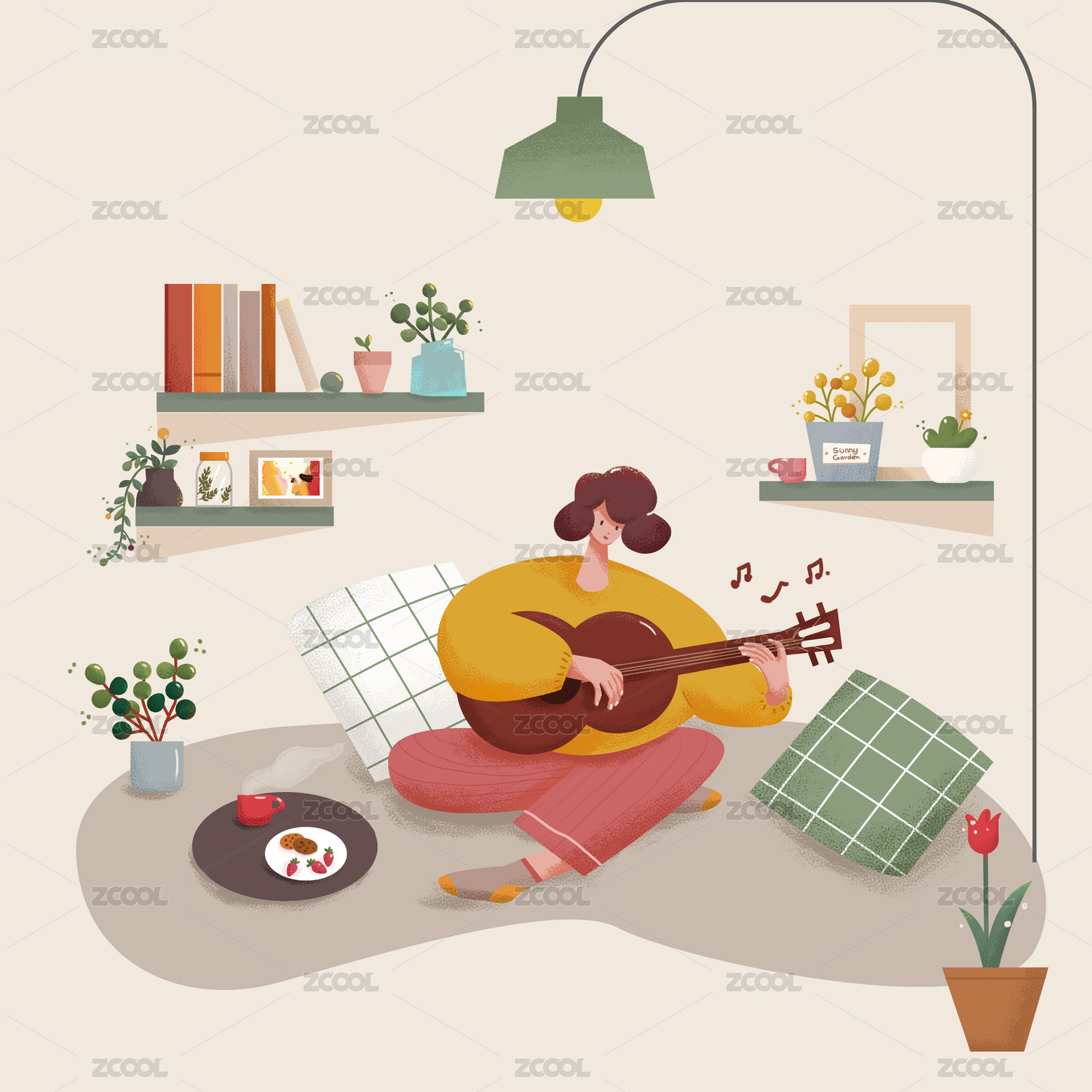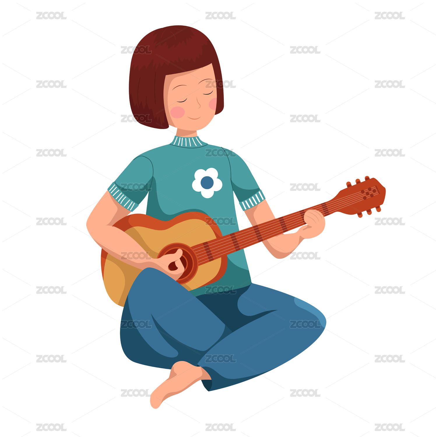 卡通女孩弹吉他立春出行春季踏青矢量插画