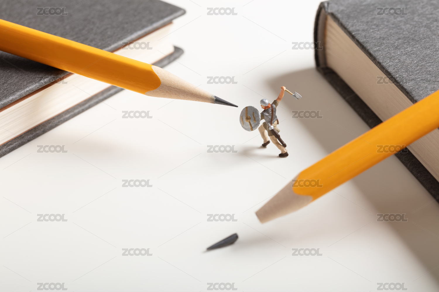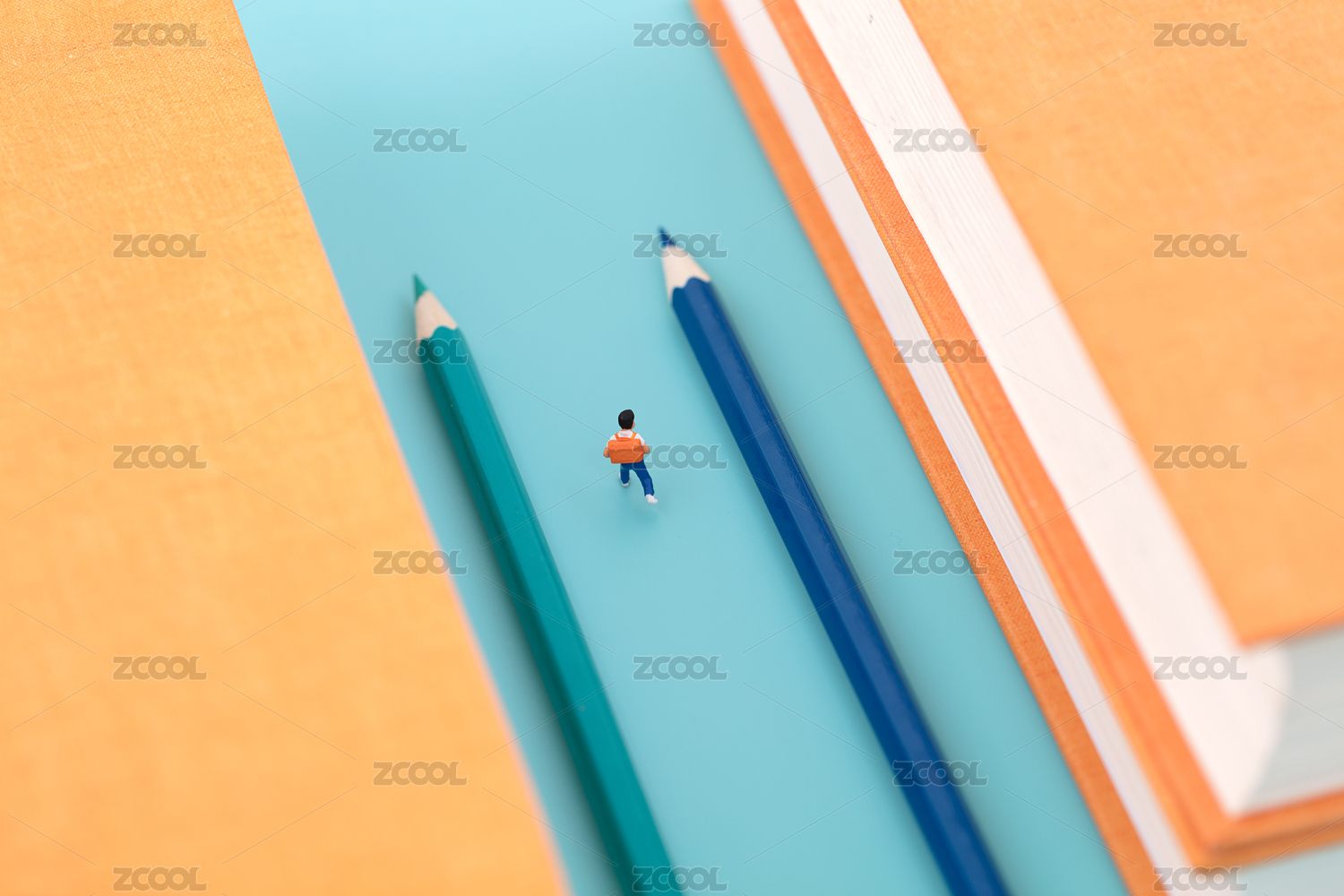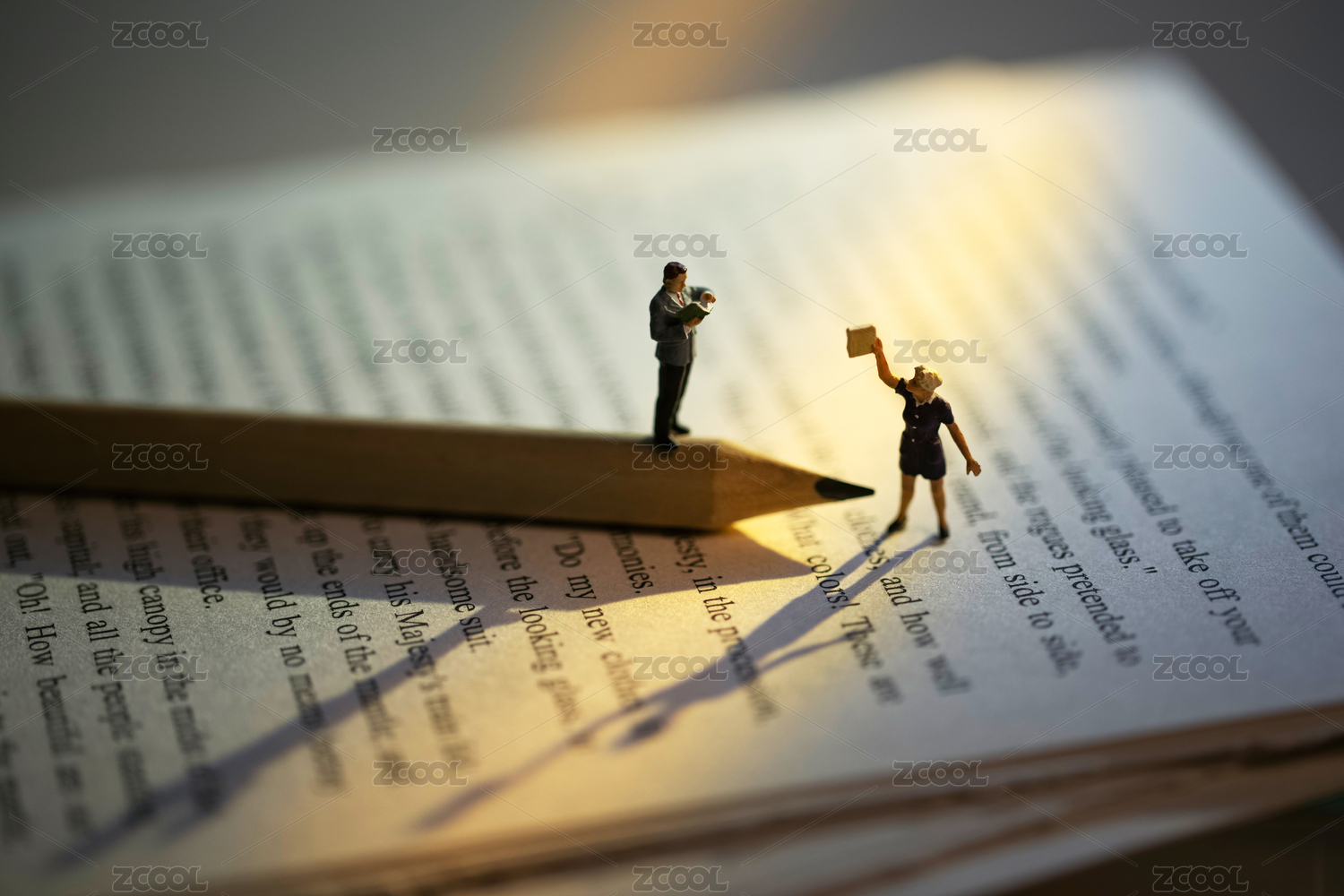 黄色卡纸背景中台灯照站在铅笔上看书的男士
